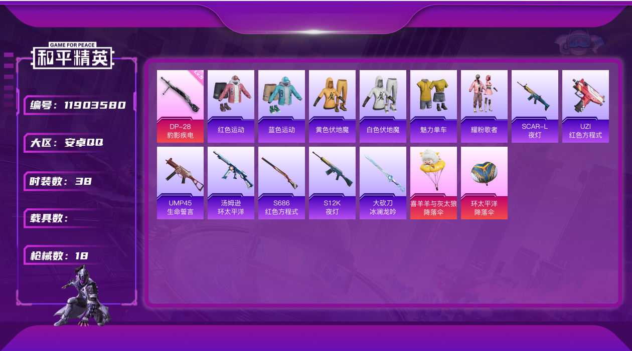 [11903580]1红装 1特效枪 可二次 可修改实名 稀有枪皮:DP-28-豹影疾电 五级特效枪:五级DP-28-豹影疾电 紫色装扮:蓝色运动,魅力单车,黄色伏地魔,白色伏地魔,红色运动,耀粉歌者 优质战备:喜羊羊与灰太狼降落伞,环太平洋降落伞