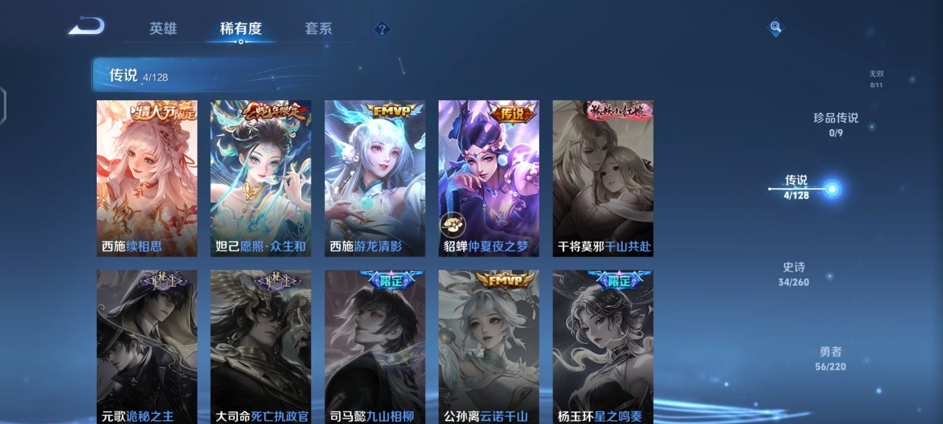 宫本武藏鬼剑武藏,兰陵王暗隐猎兽者,阿轲节奏热浪,铠曙光守护者,杨戬天秀·启明,不知火舞魅语,百里守约特工魅影,李元芳逐浪之夏,墨子金属风暴,露娜紫霞仙子,瑶遇见神鹿,娜可露露晚萤,王昭君偶像歌手
