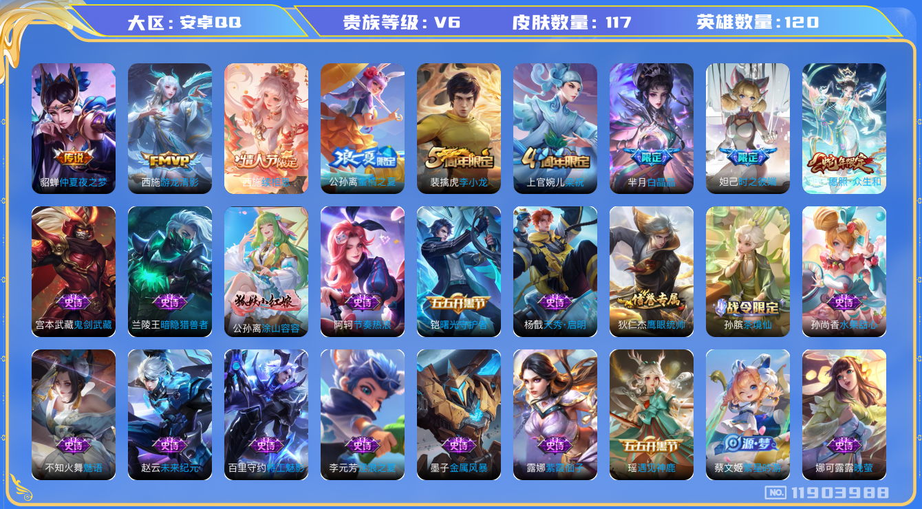 [11903988]V6 4传说 120英雄 117皮肤 可修改实名 优质装备:仲夏夜之梦(大飞蛾),游龙清影(小青龙),涂山容容 传说皮:续相思 珍宝阁皮:优雅恋人 限定皮:愿照·众生和(妲己年限),时之彼端,白晶晶,梁祝,李小龙,蜜橘之夏 史诗皮:茶境仙,遇见神鹿,紫霞仙子,特工魅影,魅语,偶像歌手,晚萤,节奏热浪,女仆咖啡,水果甜心,暗隐猎兽者,鬼剑武藏,天秀·启明,繁星吟游(呼啦呼啦),逐浪之夏,曙光守护者,金属风暴,鹰眼统帅,魅力维加斯,未来纪元-赵云