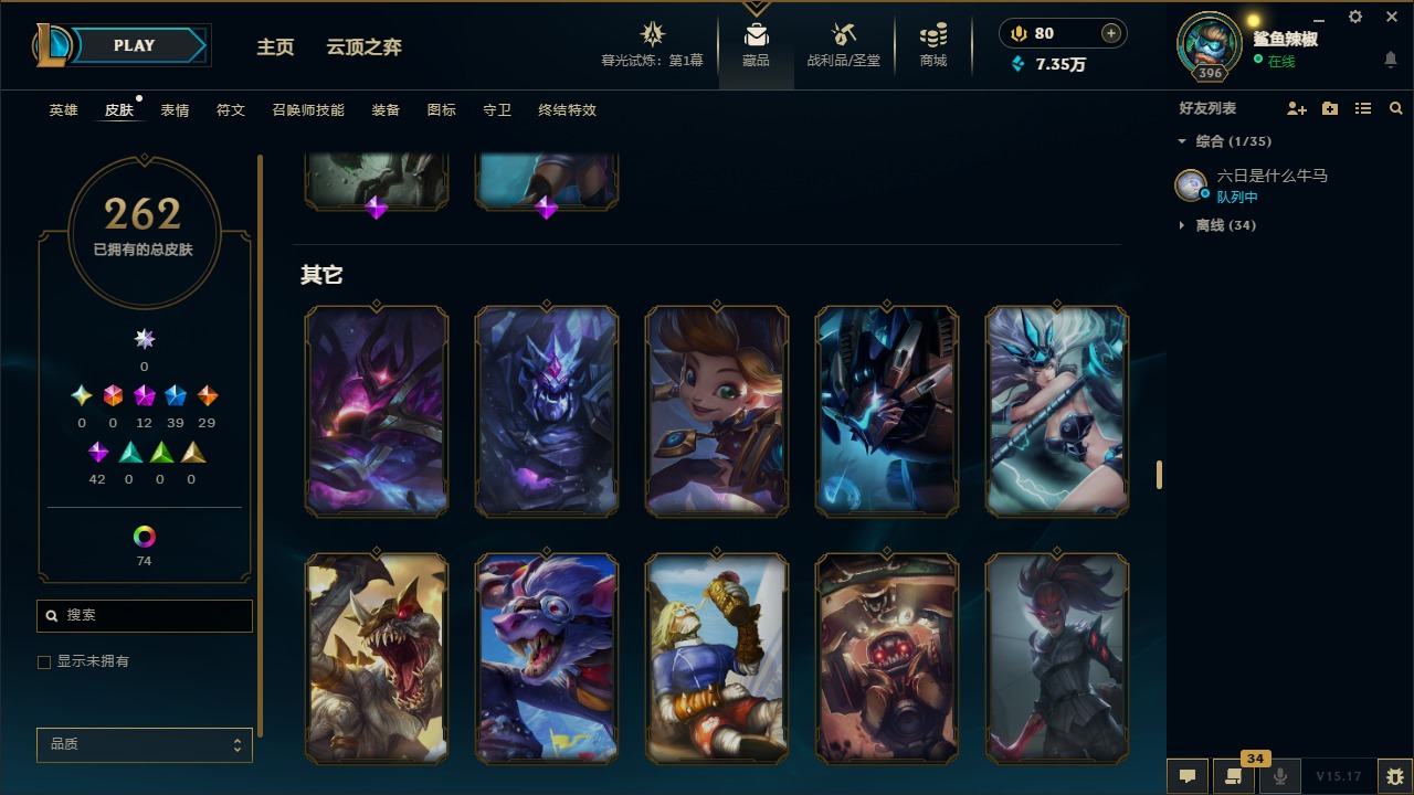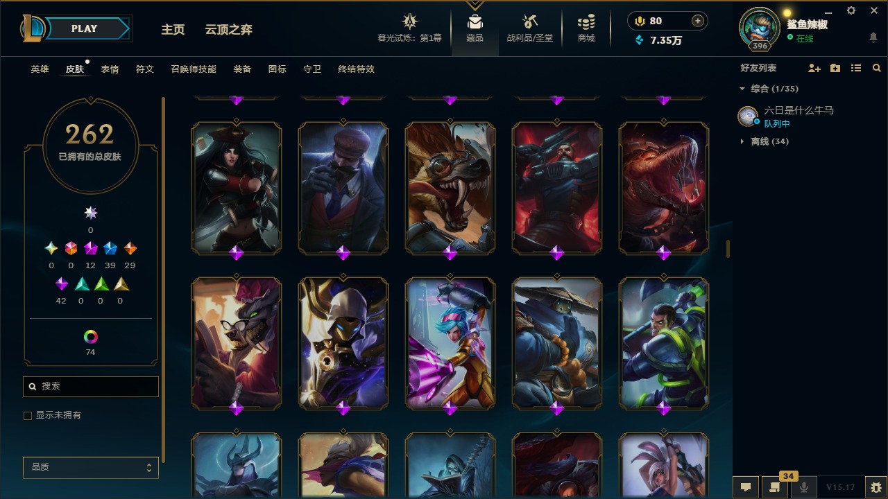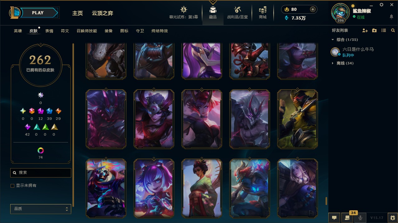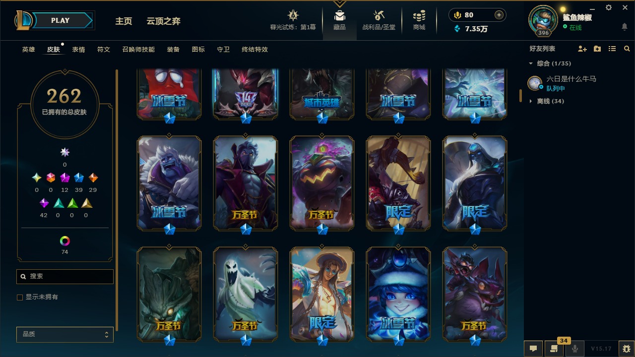 [11904545]12神话 39限定 29传说 42史诗 262皮肤 113炫彩 171英雄 可二次 可修改实名 优质装备:至臻 腥红之月 亚托克斯,至臻 魅惑女巫 厄运小姐,至臻 K/DA 卡莎,至臻 K/DA 伊芙琳,至臻 神凰行者 烈羽焰凰 霞,至臻 西部魔影 泰隆,至臻 青花瓷 丽桑卓 至臻:水晶掠夺者 卡兹克 海克斯:海克斯 玛尔扎哈 限定:双城之战2 范德尔 沃里克,玉剑传说 舞龙卫 情人节限定:甜心宝贝 娑娜 赛季限定皮:胜利之运 崔斯特,胜利剑圣 易,胜利女神 娑娜,胜利巨口 克格莫 冠军限定系列:S1FNC 酒桶,S5 SKT T1 阿利斯塔,S7 SSG 纳尔,S8 IG 卡密尔,S12 DRX 茂凯 冰雪节限定:“主人不要我了” 阿木木,冰封王子 蒙多,寒冬精灵 璐璐,魄罗骑士 瑟庄妮,幸福女神 乐芙兰,雪默丁格,北极星圣贤 基兰,北极星猎人 斯维因 泳池派对:海之歌 永恩 万圣节限定:鬼影森森 茂凯,伯爵 卡萨丁,大魔法锅 布里茨,鬼影重重 魔腾,古拉伯爵 克烈,魅惑女巫 波比,魅惑女巫 悠米,南瓜头 费德提克,死亡誓约 维克托,无头骑士 人马