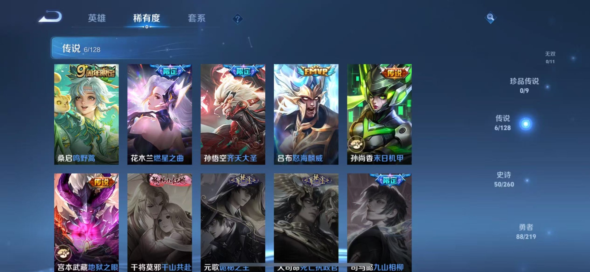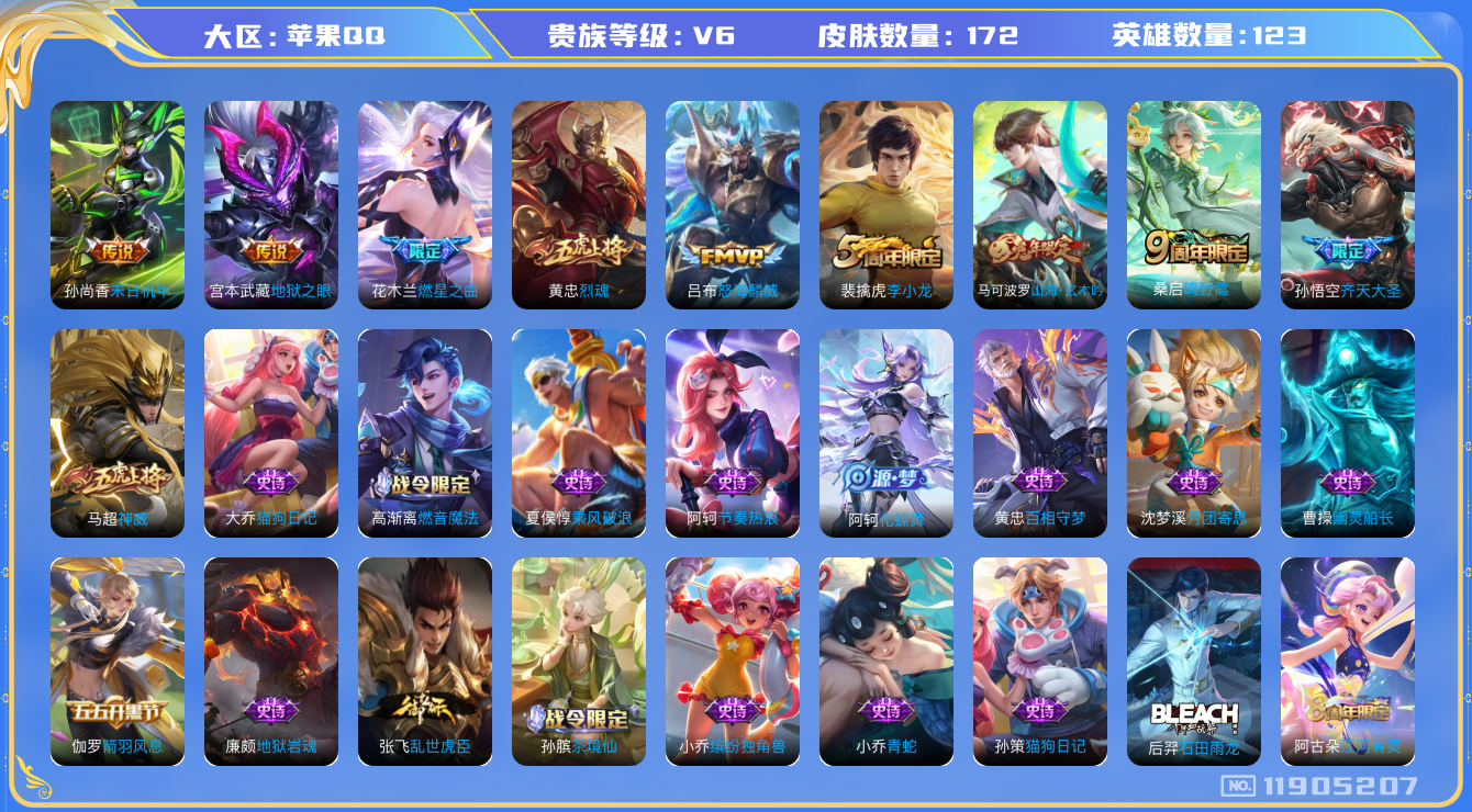 - [12235169]V10 4典藏 1无双 71传说 126英雄 455皮肤 典藏英雄武则天 可修改实名 优质装备:鸣剑·曳影,全息碎影(猴子典藏),九霄神辉(木兰典藏),银白咏叹调(倪克斯侍卫),碎月剑心(李白无双),黄金狮子座,黄金射手座,冠军飞将,云鹰飞将(小将军),绛天战甲(鸡嘴战神),黄金白羊座,久胜战神,炽阳神光,一念神魔,云霓雀翎,末日机甲-孙尚香(绿蚂蚱),地狱火,仲夏夜之梦(大飞蛾),音你心动-小乔,零号·赤焰,海洋之心,地狱之眼,音你心动-周瑜,胖达荣荣,李逍遥,时之恋人-刘备(电焊工),淬星耀世,超时空战士-狄仁杰,末日机甲-孙策,花朝如约(花篮子),挚爱之约,无双飞将,碎云,神器·狴犴令,山海·炽霜斩(李信年限),山海·琳琅生(小乔年限),山海·苍雷引(电光曜子),燃星之曲,画中仙,追逃游戏(安琪拉),电玩·雷克斯,小动物乐团,霜月吟,澜逐花归海,艾琳觅芳踪,金乌负日,黄金天蝎座,玄雷天君 传说皮:乘龙·问璇玑(孙尚香年限),乘龙·铭钟鼎(赵云年限),乘龙·淬吴钩(孙策年限),貂蝉曦玄引,吕布曦玄引,落雪白狼,幻光神枪 珍宝阁皮:女武神,玩趣恶龙 限定皮:愿照·九州拓(澜年限),愿照·千秋盛(女娲年限),鸣野蒿,至尊宝,白虎志(电光耗子),凤凰于飞,太华(伽罗年限),异界灵契(白毛香),星穹之声,绯月行,时之彼端,白晶晶,时雨天司(水龙头),神威(电光马子),飞衡(韩信年限),玄嵩(庄周年限),山海·碧波行(瑶年限),无限倾心-项羽,诗剑行,无限倾心-虞姬,齐天大圣,怒海麟威,降魔,五谷丰年,青龙志(铠年限),冰锋战神,幽恒(沐浴露),武圣,天狼运算者,游园惊梦,御风骁将(吕布年限),天狼狩猎者,龙胆,逐梦之星,烈魂,岱宗(典韦年限),虎魄,奔雷神使(牛魔年限),祈雪灵祝(雪兔子),天狼绘梦者,李小龙,朱雀志(守约年限),永曜之星,如梦令-嫦娥,如梦令-后羿,霸王别姬-项羽,霸王别姬-虞姬,默契交锋-兰陵王,默契交锋-花木兰,孙行者,一生所爱,大圣娶亲,天魔缭乱,冰霜恋舞曲,云端筑梦师,神奇女侠,枫霜尽,时之奇旅-妲己,神器·万象笔,梦圆繁星,山海·玄木吟(马可年限) 史诗皮:星界战将,灵蛊蚀心,龙之律动,石田雨龙,茶境仙,海诺心动手记,东方月初,芈月浮光幕影,上官婉儿群星魔术团,奇遇星旅,曹操夜都魔契,超元猎域,乘龙·聚宝船(安琪拉年限),乘龙·忆丹青(大
