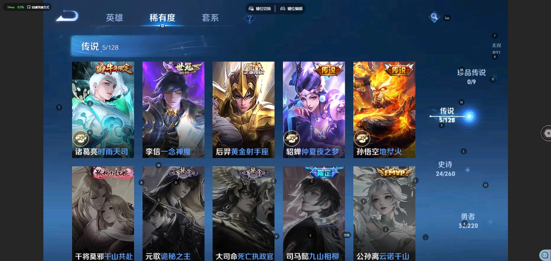 - PX_2103055-Q/至尊星耀/189皮肤/125英雄/1典藏/0珍品无双/0无双/1珍品传说/19传说/62史诗/9稀有英雄 【1 珍品传说】大耳狗之梦 瑶, 【1 典藏皮肤】拾光映像 瑶, 【19 传说皮肤】云霓雀翎 虞姬,无双飞将 马超,云鹰飞将 曜,仲夏夜之梦 貂蝉,炽阳神光 镜,时之恋人 刘备,战鼓燎原 典韦,炽翼辉光 伽罗,乘龙·铭钟鼎 赵云,妄想实况 马可波罗,冥王哈迪斯 铠,心