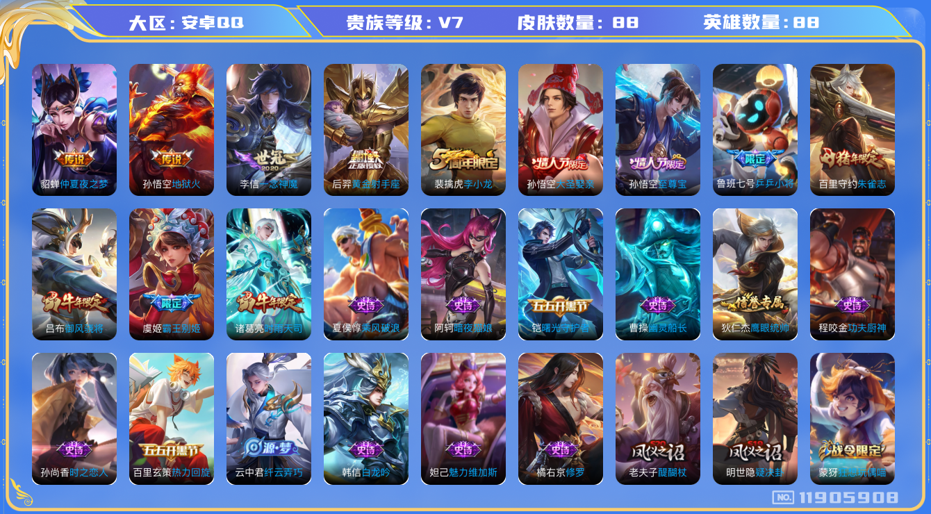 [11905908]V7 5传说 88英雄 88皮肤 可修改实名 优质装备:黄金射手座,一念神魔,地狱火,仲夏夜之梦(大飞蛾) 限定皮:至尊宝,时雨天司(水龙头),御风骁将(吕布年限),李小龙,朱雀志(守约年限),霸王别姬-虞姬,大圣娶亲,乒乒小将 史诗皮:白龙吟,暗夜猫娘,时之恋人-孙尚香,修罗,功夫厨神,幽灵船长,纤云弄巧,乘风破浪,曙光守护者,热力回旋,鹰眼统帅,魅力维加斯