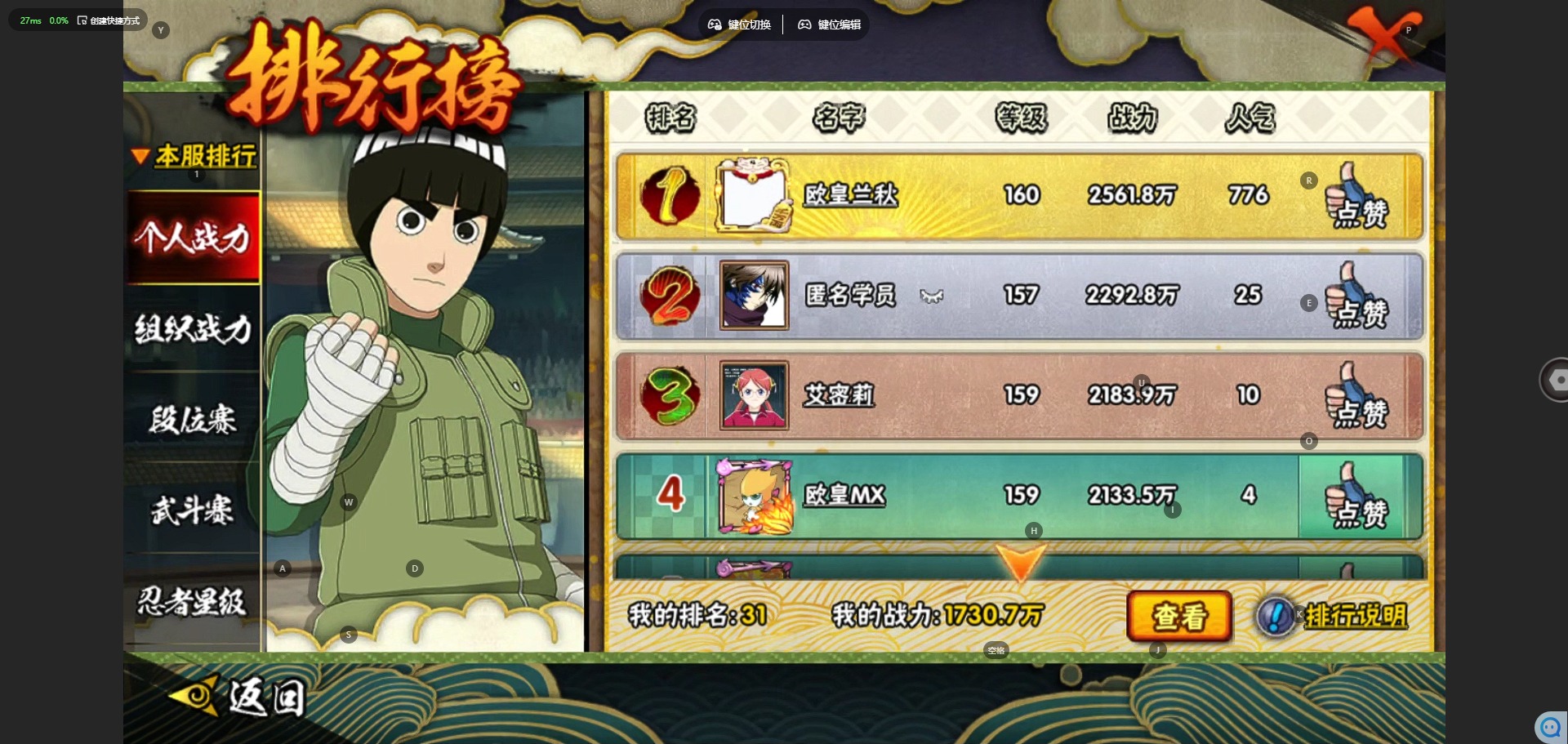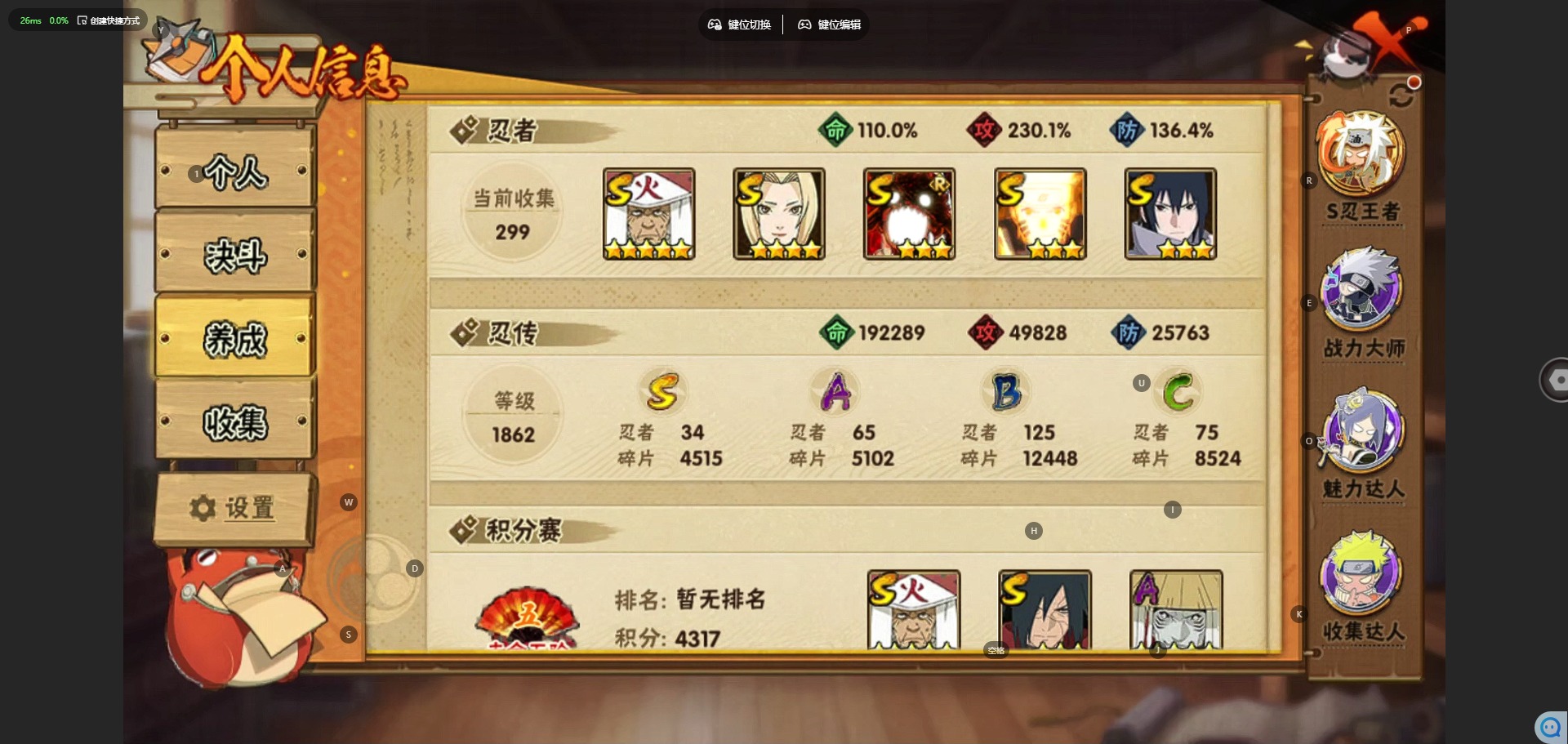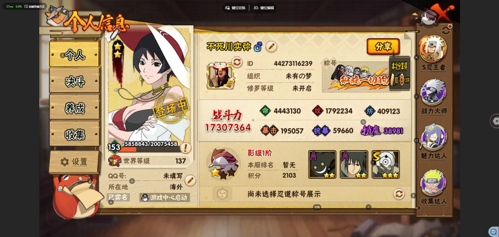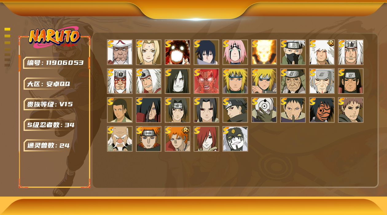 [11906053]V15 34S忍 49A忍 24通灵 1730.7W战力 可二次 可修改实名 优质装备:熊猫,千手柱间「秽土转生」,罗砂「四代目风影」,宇智波鼬「秽土转生」,佩恩·天道「超」,宇智波斑「秽土转生」,千手扉间「秽土转生」,波风水门「秽土转生」,猿飞日斩「秽土转生」,长门「秽土转生」,迈特凯「死门」,宇智波带土 「忍界大战」,“宇智波斑” 「白面具」,漩涡鸣人 「九喇嘛连结」,春野樱 「忍界大战」,神秘面具男 「红夜之刃」,宇智波佐助「永恒万花筒」,千手柱间·木叶创立,大筒木桃式,宇智波止水「须佐能乎」,旗木卡卡西「须佐能乎」,自来也 「传说中的三忍」,漩涡鸣人 「暴怒·第六尾」 S级忍者:大野木 「忍界大战」,自来也 「舞之豪杰」,自来也「仙人模式」,宇智波鼬 「须佐能乎」,佩恩「天道」,猿飞日斩,波风水门,大蛇丸,自来也,纲手