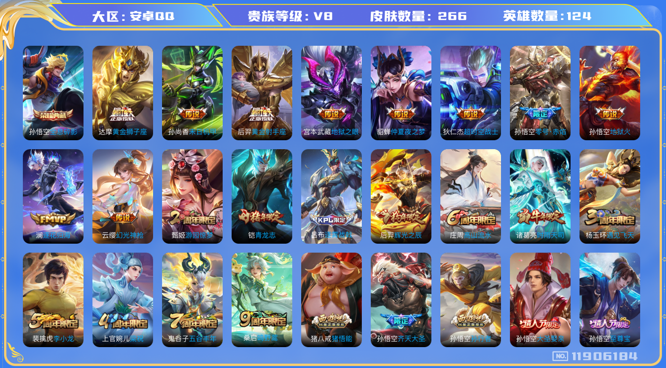[11906184]V8 1典藏 14传说 124英雄 266皮肤 可修改实名 优质装备:全息碎影(猴子典藏),黄金狮子座,黄金射手座,末日机甲-孙尚香(绿蚂蚱),地狱火,仲夏夜之梦(大飞蛾),零号·赤焰,地狱之眼,超时空战士-狄仁杰,澜逐花归海,涂山容容 传说皮:幻光神枪 珍宝阁皮:妄想食味,女武神 限定皮:逐霄战戟,鸣野蒿,至尊宝,时雨天司(水龙头),遇见飞天,高山流水,齐天大圣,五谷丰年,青龙志(铠年限),游园惊梦,梁祝,李小龙,辉光之辰,孙行者,猪悟能,大圣娶亲,美猴王 史诗皮:星界战将,石田雨龙,紫霞仙子,电玩小子(小书包),白龙吟,黄金分割率,特工魅影,千年之狐,江河有灵,蒙恬荣光圣徽,冰冠公主,偶像歌手,暗夜猫娘,末日机甲-吕布,乱世虎臣,节奏热浪,女仆咖啡,摇滚巨星,水果甜心,天才门将,星夜王子,心灵骇客,功夫厨神,德古拉伯爵,暗隐猎兽者,鬼剑武藏,心灵战警,舞动绿茵,地狱岩魂,繁星吟游(呼啦呼啦),缤纷独角兽,乘风破浪,逐浪之夏,水晶猎龙者,曙光守护者,金属风暴,原初追逐者,圣诞狂欢,圣诞恋歌,鹰眼统帅,魅力维加斯,黎明之约,未来纪元-赵云