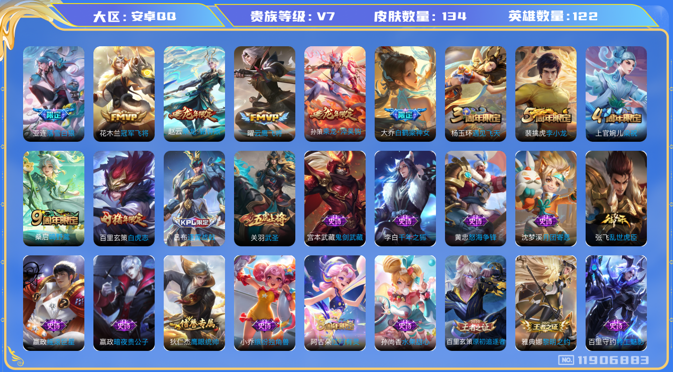 [11906883]V7 8传说 122英雄 134皮肤 可修改实名 嬴政大国标 关羽小国标 苍小国标 优质装备:冠军飞将,云鹰飞将(小将军) 传说皮:乘龙·铭钟鼎(赵云年限),乘龙·淬吴钩(孙策年限),落雪白狼 珍宝阁皮:优雅恋人 限定皮:逐霄战戟,鸣野蒿,白虎志(电光耗子),白鹤梁神女,遇见飞天,武圣,梁祝,李小龙 史诗皮:怒海争锋,决胜骁骑,特工魅影,千年之狐,江河有灵,龙骑士(小龙虾),乱世虎臣,修罗,摇滚巨星,水果甜心,鬼剑武藏,缤纷独角兽,月团寄思,原初追逐者,鹰眼统帅,暗夜贵公子,魅力维加斯,黎明之约