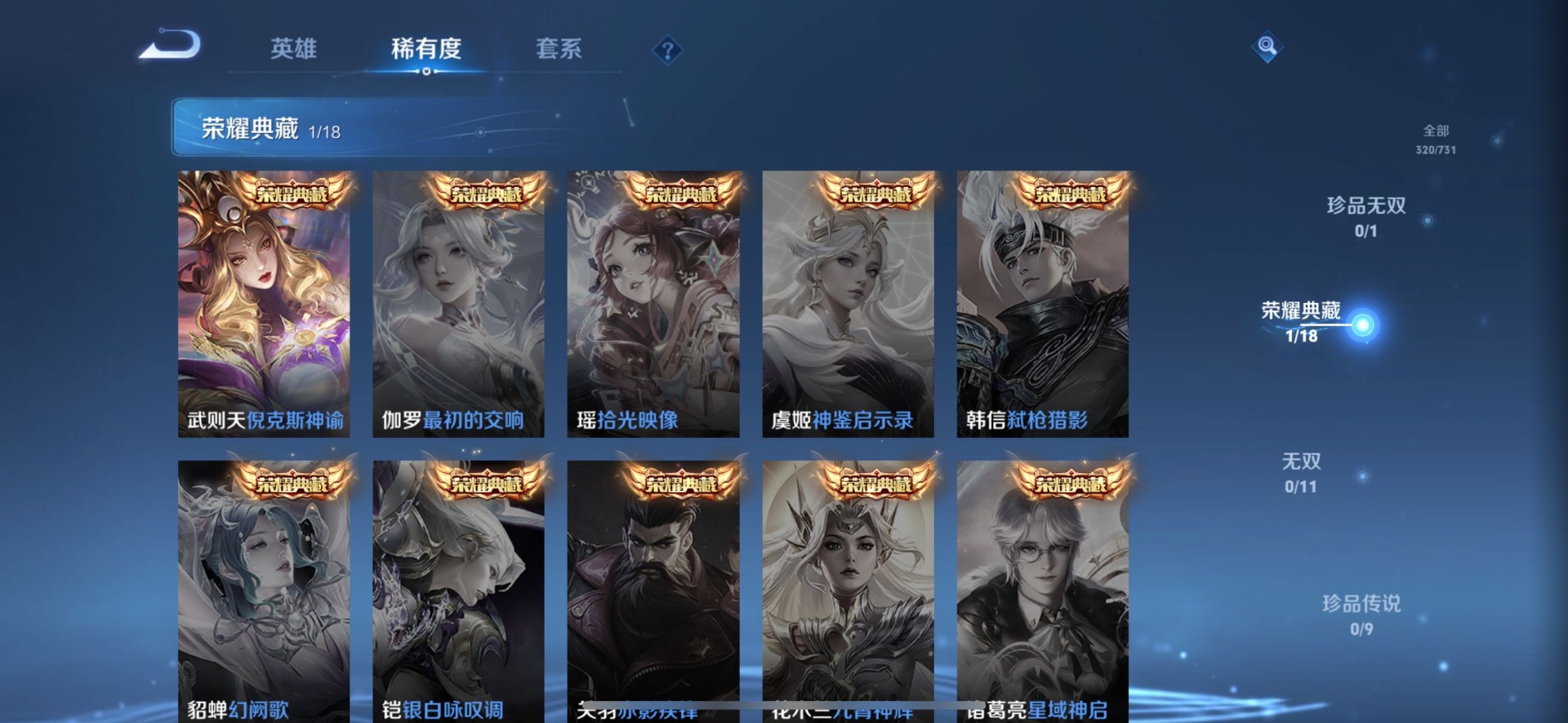 - PX_2083127-17 安卓QQ/至尊星耀/191皮肤/122英雄/4典藏/0珍品无双/0无双/1珍品传说/22传说/51史诗/8稀有英雄 【1 珍品传说】朽木白哉 暃, 【4 典藏皮肤】鸣剑·曳影 李白,活力突击 程咬金,银白咏叹调 铠,九霄神辉 花木兰, 【22 传说皮肤】枫霜尽 橘右京,星穹之声 王昭君,启明星使 虞姬,前尘镜 娜可露露,无限倾心 虞姬,逐花归海 澜,李逍遥 曜,零号·