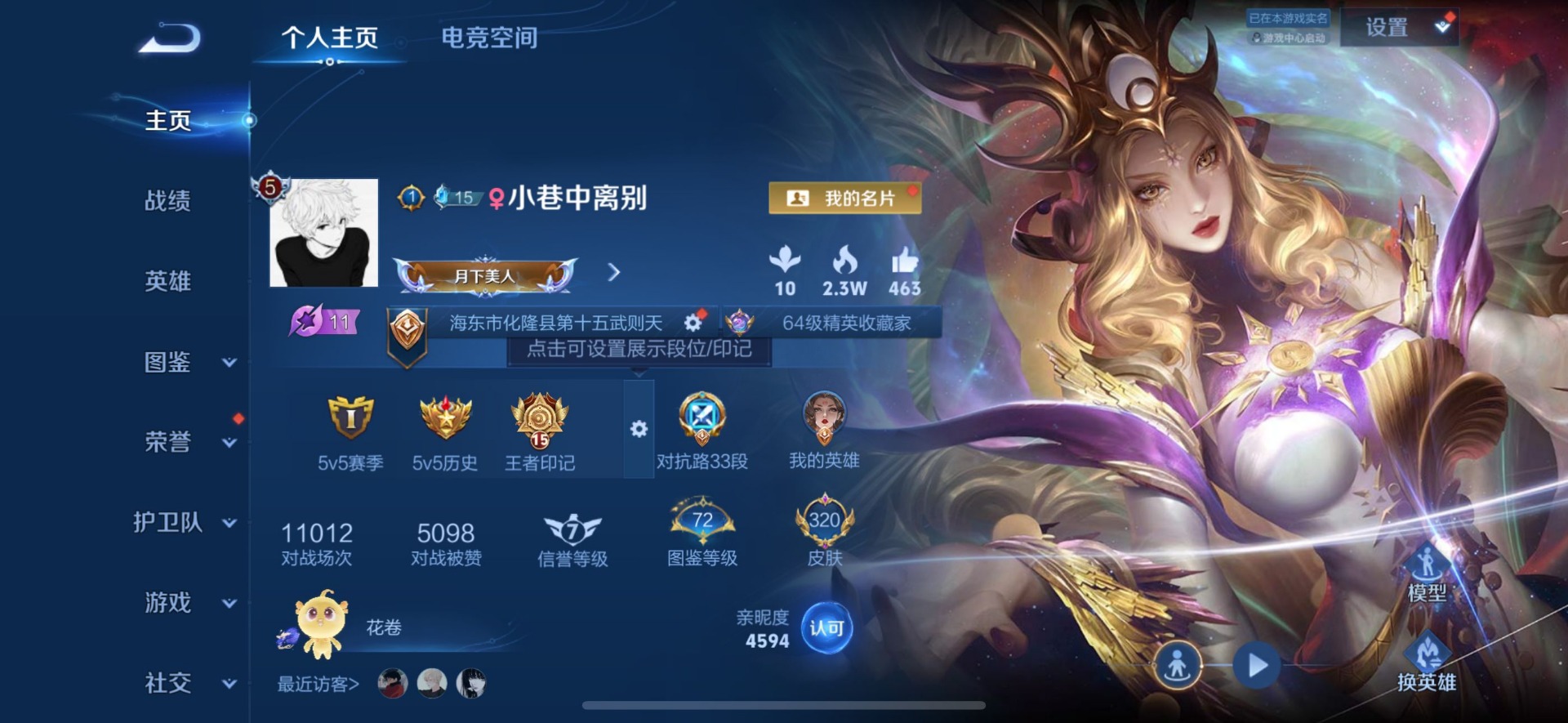 - PX_2095033-实名: 可修改 贵族等级: V5 英雄数: 80 皮肤数: 47 传说皮: 云霓雀翎,乘龙·问璇玑,貂蝉曦玄引 限定皮: 鸣野蒿
