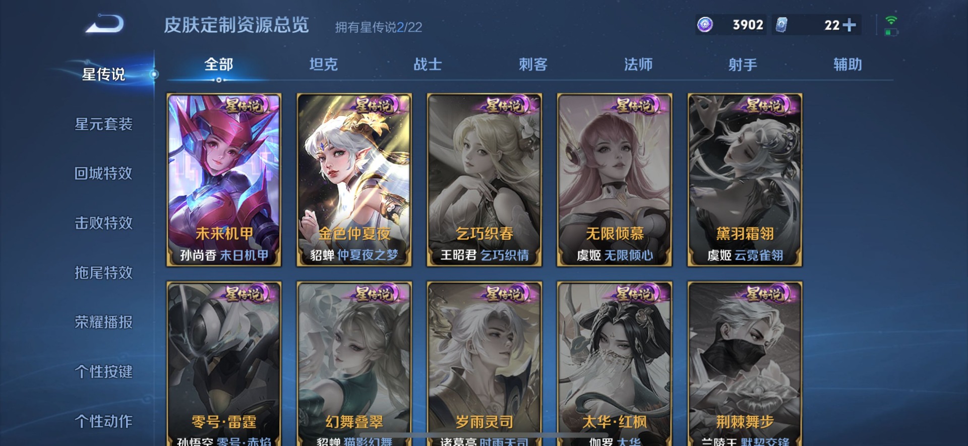 伽罗天狼溯光者,孙膑寅虎·展翼,露娜一生所爱,镜匿光追影者,杨玉环寅虎·心曲,公孙离玉兔公主,裴擒虎李小龙,上官婉儿梁祝,桑启鸣野蒿,猪八戒猪悟能,孙悟空至尊宝,马超神威,韩信傲雪梅枪,百里守约朱雀志