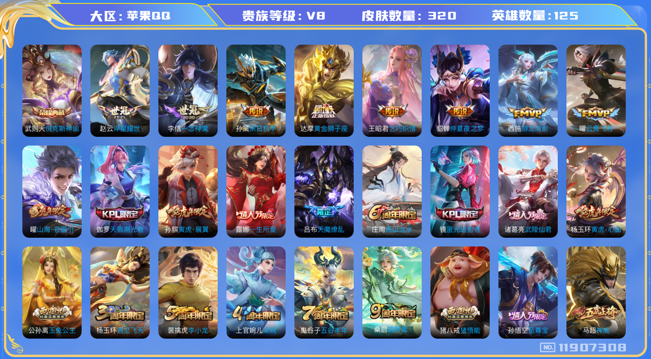 [11907308]V8 1典藏 13传说 125英雄 320皮肤 典藏英雄武则天 可修改实名 优质装备:倪克斯神谕(宇宙婆娘),黄金狮子座,云鹰飞将(小将军),一念神魔,仲夏夜之梦(大飞蛾),乞巧织情,游龙清影(小青龙),淬星耀世,末日机甲-孙策,山海·苍雷引(电光曜子),涂山容容 珍宝阁皮:妄想食味,蔷薇恋人,女武神 限定皮:鸣野蒿,至尊宝,武陵仙君(小桃花),傲雪梅枪,寅虎·展翼(孙膑年限),神威(电光马子),遇见飞天,高山流水,五谷丰年,梁祝,天狼溯光者,李小龙,朱雀志(守约年限),猪悟能,一生所爱,天魔缭乱,匿光追影者,寅虎·心曲(虎婆),玉兔公主 史诗皮:灵蛊蚀心,星界战将,遇见神鹿,紫霞仙子,苍穹之光,电玩小子(小书包),黄金分割率,特工魅影,千年之狐,永昼,江河有灵,魅语,蒙恬荣光圣徽,无限星赏官,冰冠公主,偶像歌手,晚萤,电玩·爆裂旋风,暗夜猫娘,末日机甲-吕布,猫狗日记-孙策,猫狗日记-大乔,时之恋人-孙尚香,乱世虎臣,节奏热浪,修罗,女仆咖啡,摇滚巨星,水果甜心,绅士熊喵,天才门将,星夜王子,心灵骇客,功夫厨神,德古拉伯爵,暗隐猎兽者,幽灵船长,鬼剑武藏,暗渊魔法,心灵战警,舞动绿茵,地狱岩魂,诗语江南,纤云弄巧,繁星吟游(呼啦呼啦),拒霜思,缤纷独角兽,乘风破浪,逐浪之夏,水晶猎龙者,曙光守护者,箭羽风息,金属风暴,原初追逐者,圣诞狂欢,圣诞恋歌,鹰眼统帅,暗夜贵公子,魅力维加斯,黎明之约,赏金猎手,无心,未来纪元-赵云
