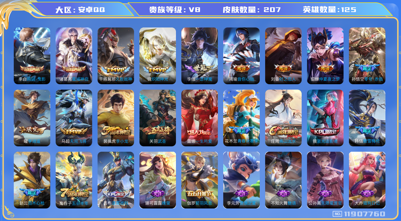 [11907760]【商品标题】:安卓Q-V8-至尊星耀I段位-125英雄-207皮肤-2典藏-0珍品无双-0无双-0珍品传说-11传说-63史诗
