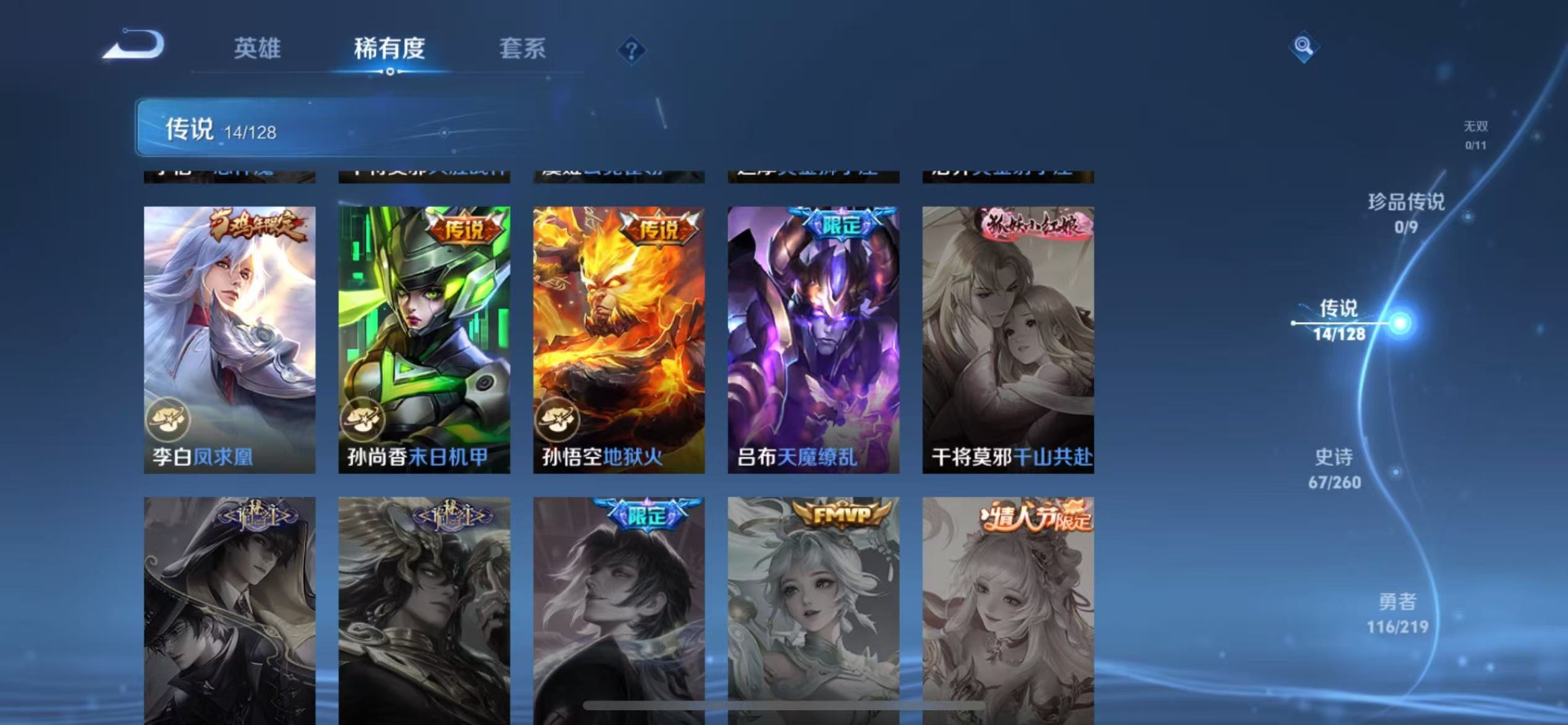 黄忠烈魂,赵云龙胆,后羿如梦令,诸葛亮时雨天司,裴擒虎李小龙,上官婉儿梁祝,孙悟空大圣娶亲,孙悟空至尊宝,韩信飞衡,关羽武圣
