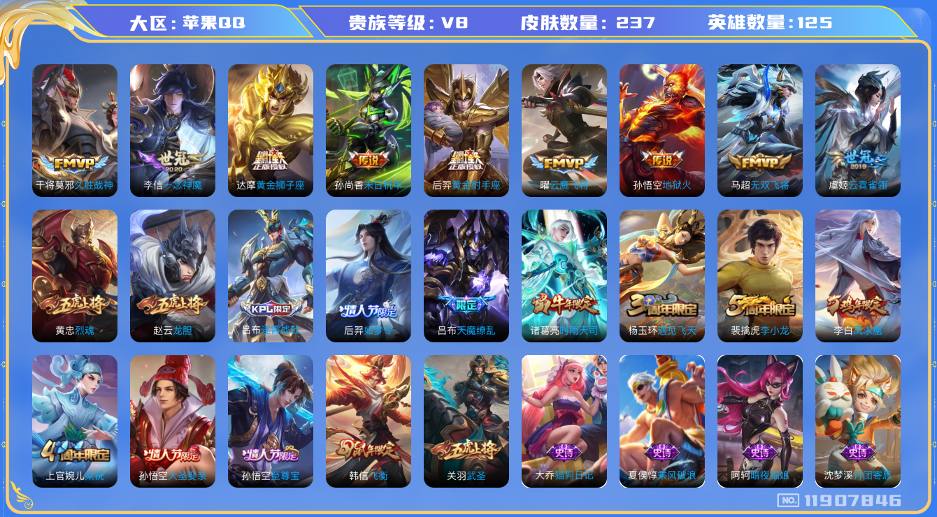 [11907846]V8 14传说 125英雄 237皮肤 可修改实名 优质装备:黄金狮子座,黄金射手座,云鹰飞将(小将军),久胜战神,一念神魔,云霓雀翎,末日机甲-孙尚香(绿蚂蚱),地狱火,无双飞将,涂山容容 珍宝阁皮:玩趣恶龙 限定皮:逐霄战戟,至尊宝,凤求凰(白切鸡),时雨天司(水龙头),飞衡(韩信年限),遇见飞天,武圣,梁祝,龙胆,烈魂,李小龙,如梦令-后羿,大圣娶亲,天魔缭乱 史诗皮:龙之律动,百相守梦-百里守约,紫霞仙子,电玩小子(小书包),黄金分割率,特工魅影,千年之狐,永昼,江河有灵,百解令(蒙犽),无限星赏官,冰冠公主,偶像歌手,晚萤,暗夜猫娘,猫狗日记-孙策,猫狗日记-大乔,修罗,女仆咖啡,摇滚巨星,水果甜心,绅士熊喵,星夜王子,心灵骇客,暗隐猎兽者,幽灵船长,鬼剑武藏,心灵战警,地狱岩魂,纤云弄巧,繁星吟游(呼啦呼啦),拒霜思,缤纷独角兽,乘风破浪,逐浪之夏,月团寄思,水晶猎龙者,曙光守护者,箭羽风息,金属风暴,原初追逐者,圣诞狂欢,圣诞恋歌,鹰眼统帅,魅力维加斯,黎明之约,无心,未来纪元-赵云