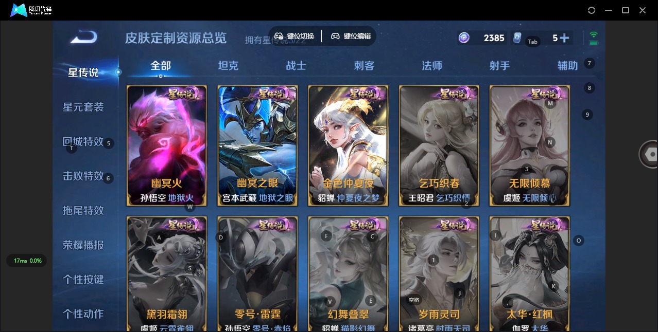 黄忠烈魂,甄姬幽恒,曹操天狼征服者,伽罗天狼溯光者,伽罗太华,张飞虎魄,赵云龙胆,孙膑天狼运算者,干将莫邪冰霜恋舞曲,典韦岱宗,牛魔奔雷神使,鲁班七号乒乒小将,项羽霸王别姬,吕布御风骁将,后羿如梦令,后羿辉光之辰,庄周玄嵩,诸葛亮时雨天司,公孙离祈雪灵祝,兰陵王默契交锋,裴擒虎李小龙,上官婉儿梁祝,上官婉儿天狼绘梦者,花木兰默契交锋,马可波罗山海·玄木吟,桑启鸣野蒿,猪八戒猪悟能,孙悟空大圣娶亲,芈月白晶晶,孙悟空至尊宝,马超神威,赵云引擎之心,妲己时之彼端,韩信飞衡,韩信逐梦之影,百里守约朱雀志,虞姬霸王别姬,嫦娥如梦令,王昭君凤凰于飞