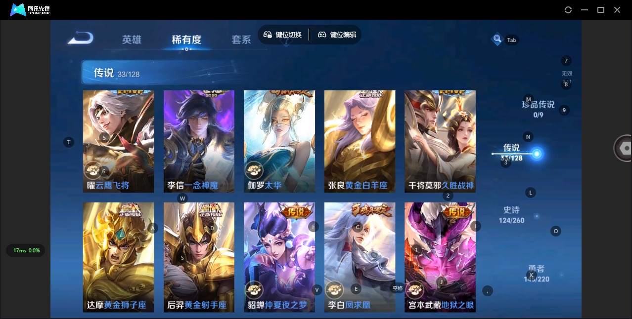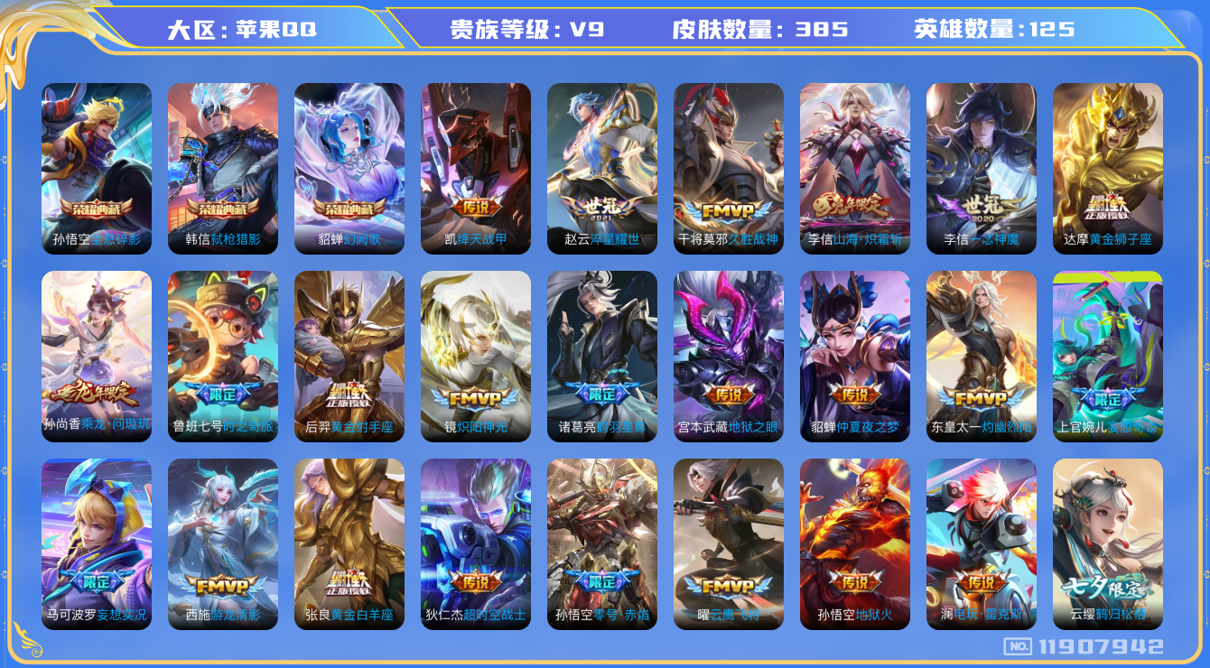 - [11792034]V7 9传说 125英雄 223皮肤 可修改实名 女号 优质装备:黄金射手座,云鹰飞将(小将军),末日机甲-孙尚香(绿蚂蚱),仲夏夜之梦(大飞蛾),超时空战士-狄仁杰 珍宝阁皮:蔷薇恋人,女武神 限定皮:鸣野蒿,至尊宝,白虎志(电光耗子),凤求凰(白切鸡),凤凰于飞,太华(伽罗年限),遇见飞天,高山流水,冰锋战神,游园惊梦,梁祝,岱宗(典韦年限),李小龙,霸王别姬-虞姬,猪悟能 史诗皮:蒙犽顽岩魄,百相守梦-百里守约,百相守梦-黄忠,电玩小子(小书包),白龙吟,黄金分割率,千年之狐,冰冠公主,龙骑士(小龙虾),猫狗日记-孙策,乱世虎臣,节奏热浪,水果甜心,绅士熊喵,天才门将,星夜王子,德古拉伯爵,暗隐猎兽者,幽灵船长,心灵战警,缤纷独角兽,乘风破浪,逐浪之夏,水晶猎龙者,箭羽风息,金属风暴,原初追逐者,圣诞狂欢,圣诞恋歌,鹰眼统帅,王者之锤,暗夜贵公子,魅力维加斯,黎明之约,未来纪元-赵云