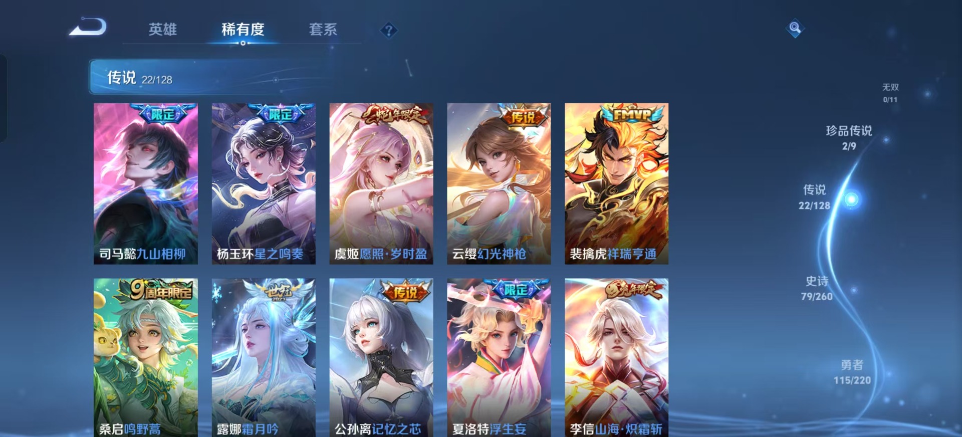 - [11884635]V7 1典藏 3传说 124英雄 274皮肤 可修改实名 优质装备:神鉴启示录,炽阳神光 珍宝阁皮:万物之道,蔷薇恋人 限定皮:愿照·岁时盈(虞姬年限),逐霄战戟,鸣野蒿,白晶晶,玄嵩(庄周年限),遇见飞天,五谷丰年,冰锋战神,梁祝,李小龙,霸王别姬-虞姬 史诗皮:器灵·浮梦炉,星界战将,芈月浮光幕影,蔬乡物语(鲁班七号),百相守梦-百里守约,紫霞仙子,黄金分割率,魅语,蒙恬荣光圣徽,冰冠公主,偶像歌手,白蛇,龙骑士(小龙虾),乱世虎臣,节奏热浪,女仆咖啡,水果甜心,绅士熊喵,星夜王子,心灵骇客,德古拉伯爵,暗隐猎兽者,鬼剑武藏,心灵战警,舞动绿茵,地狱岩魂,纤云弄巧,繁星吟游(呼啦呼啦),拒霜思,缤纷独角兽,乘风破浪,逐浪之夏,曙光守护者,箭羽风息,金属风暴,原初追逐者,圣诞狂欢,圣诞恋歌,鹰眼统帅,王者之锤,暗夜贵公子,魅力维加斯,黎明之约,未来纪元-赵云