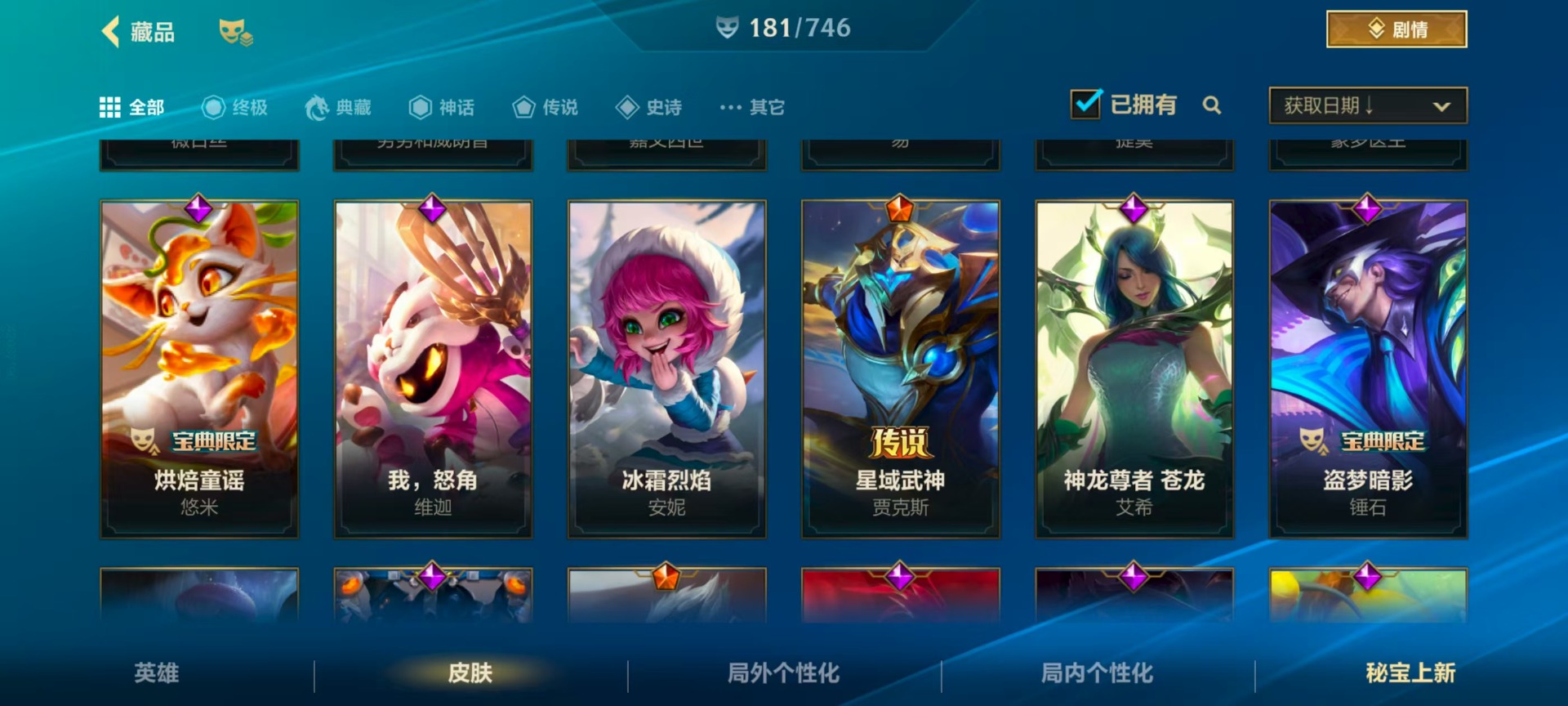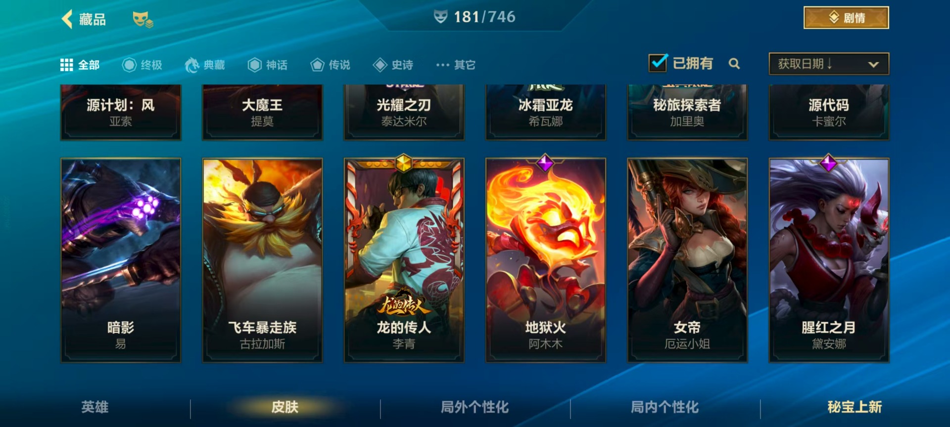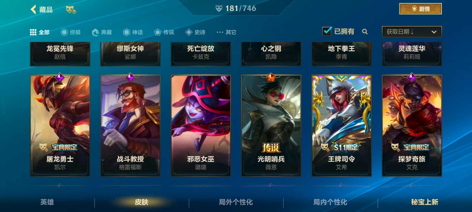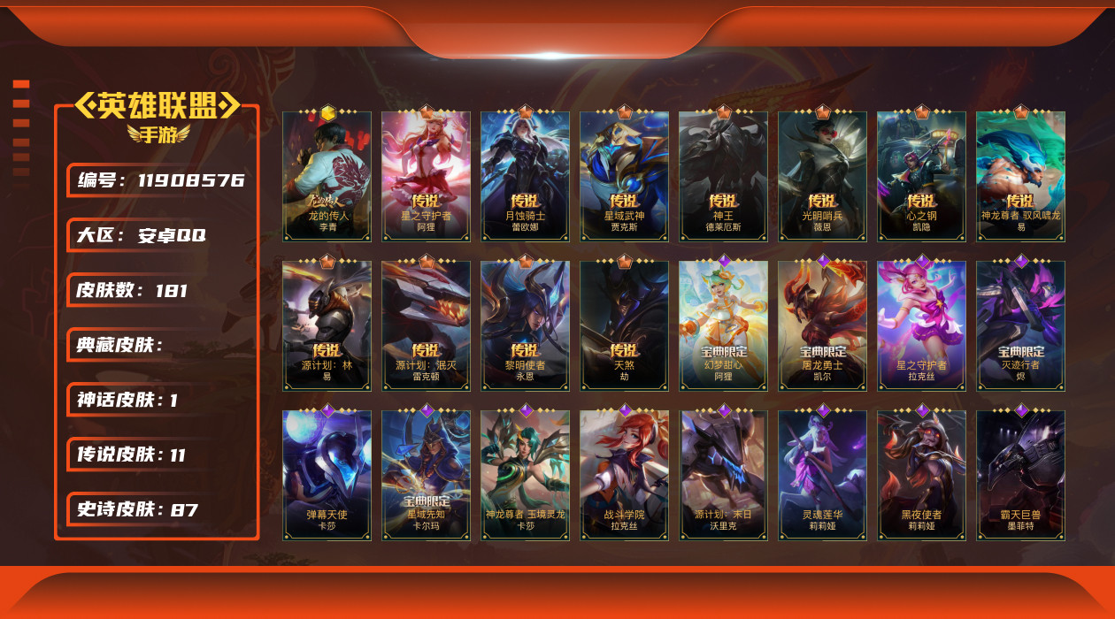 [11908576]1神话 11传说 87史诗 181皮肤 可二次 可修改实名 优质装备:光明哨兵薇恩,神龙尊者 驭风啸龙,神王诺手,天煞劫,星之守护者阿狸,月蚀骑士蕾欧娜,玉剑传说 武剑仙,源计划:林,源计划:泯灭,龙的传人,星域武神贾克斯,心之钢凯隐,龙的传人 段位:铂金 传说皮:黎明使者永恩 亮点:光明哨兵薇恩,神龙尊者 驭风啸龙,神王诺手,天煞劫,星之守护者阿狸,月蚀骑士蕾欧娜,玉剑传说 武剑仙,源计划:林,源计划:泯灭,龙的传人,星域武神贾克斯,心之钢凯隐,龙的传人