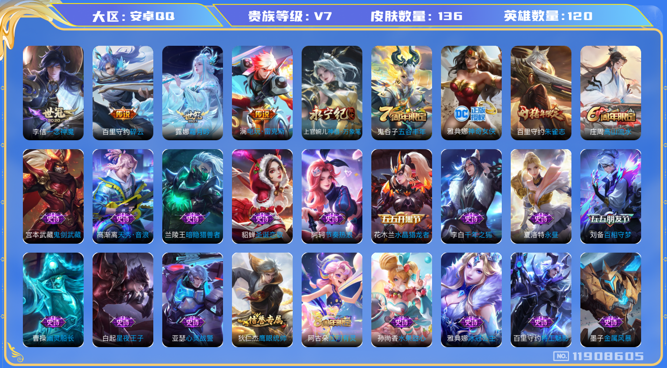 [11908605]V7 4传说 120英雄 136皮肤 可修改实名 优质装备:一念神魔,碎云,电玩·雷克斯,霜月吟 珍宝阁皮:玩趣恶龙 限定皮:高山流水,五谷丰年,朱雀志(守约年限),神奇女侠,神器·万象笔 史诗皮:紫霞仙子,特工魅影,千年之狐,永昼,江河有灵,冰冠公主,偶像歌手,电玩·爆裂旋风,百相守梦(刘备),末日机甲-吕布,节奏热浪,修罗,水果甜心,星夜王子,暗隐猎兽者,幽灵船长,鬼剑武藏,心灵战警,水晶猎龙者,金属风暴,圣诞恋歌,鹰眼统帅,魅力维加斯,天秀·音浪,无心
