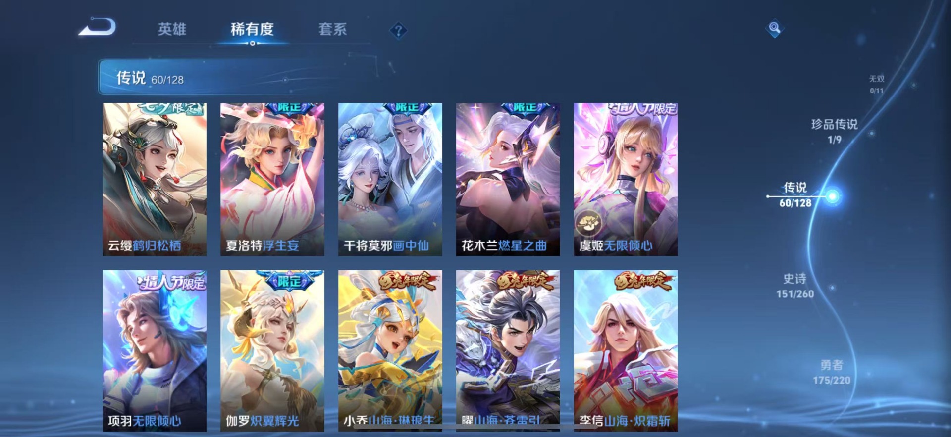 夏侯惇匿光决锋者,黄忠烈魂,甄姬至美·化雀舞,铠青龙志,廉颇寅虎·御盾,伽罗天狼溯光者,苏烈玄武志,张飞虎魄,赵云百木心枪,赵云龙胆,小乔纯白花嫁,典韦岱宗,孙尚香异界灵契,不知火舞绯月行,鲁班七号乒乒小将,吕布御风骁将,后羿如梦令,诸葛亮时雨天司,杨玉环寅虎·心曲,兰陵王影龙天霄,貂蝉逐梦之音,裴擒虎李小龙,裴擒虎天狼狩猎者,裴擒虎寅虎·赤拳,上官婉儿梁祝,上官婉儿神器·万象笔,李白诗剑行,花木兰瑞麟志,花木兰青春决赛季,马可波罗逐梦之星,马可波罗山海·玄木吟,马可波罗深海之息,西施至美·乘鲤谣,孙悟空孙行者,孙悟空大圣娶亲,百里玄策白虎志,马超神威,韩信傲雪梅枪,百里守约朱雀志,瑶山海·碧波行,澜愿照·九州拓,虞姬霸王别姬,虞姬愿照·岁时盈,娜可露露前尘镜,嫦娥如梦令,关羽冰锋战神,橘右京枫霜尽