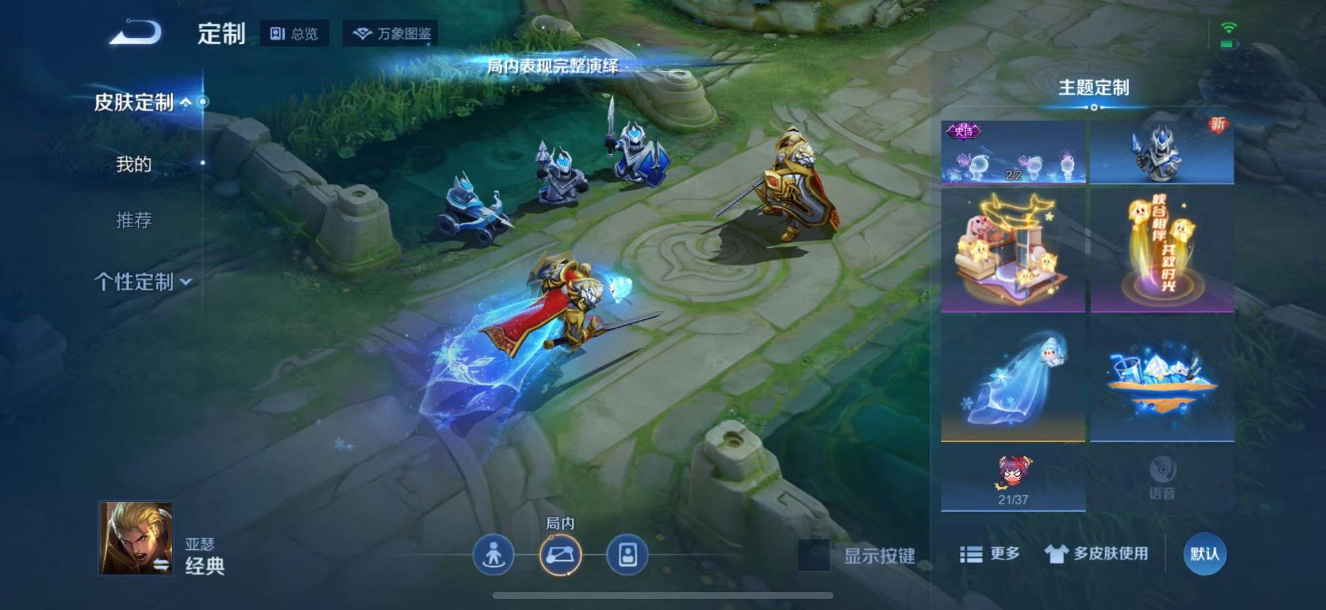 大乔时之奇旅,赵云乘龙·铭钟鼎,赵云淬星耀世,典韦战鼓燎原,干将莫邪画中仙,孙尚香音你闪耀,孙策乘龙·淬吴钩,达摩黄金狮子座,孙尚香乘龙·问璇玑,海月金乌负日,吕布曦玄引,吕布遇见神鼓,镜炽阳神光,亚连落雪白狼,宫本武藏惊梅引,貂蝉遇见胡旋,貂蝉猫影幻舞,夏洛特浮生妄,艾琳觅芳踪,狄仁杰神器·狴犴令,狄仁杰夜礼服假面,孙悟空零号·赤焰,曜云鹰飞将,曜李逍遥,马超无双飞将,李元芳飞鸢探春,百里守约碎云,澜逐花归海,虞姬云霓雀翎,貂蝉曦玄引,王昭君永恒水手月亮,云缨幻光神枪