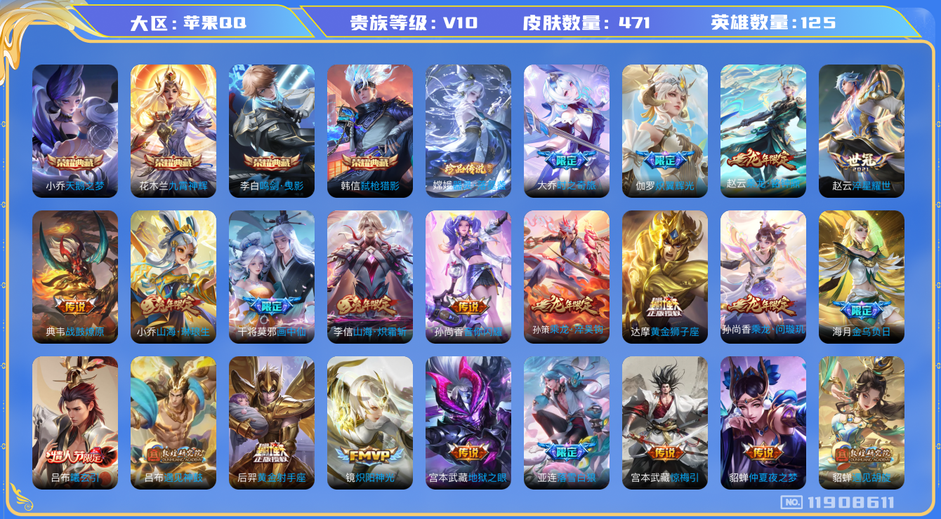 [11908611]V10 4典藏 1珍品传说 60传说 125英雄 471皮肤 可修改实名 优质装备:天鹅之梦(小乔典藏),鸣剑·曳影,九霄神辉(木兰典藏),弑枪猎影(韩信典藏),器灵·落星盏,黄金狮子座,黄金射手座,云鹰飞将(小将军),猫影幻舞,炽阳神光,云霓雀翎,仲夏夜之梦(大飞蛾),零号·赤焰,地狱之眼,飞鸢探春,李逍遥,淬星耀世,超时空战士-狄仁杰,遇见胡旋,无双飞将,音你闪耀(rap皮),碎云,神器·狴犴令,山海·炽霜斩(李信年限),山海·琳琅生(小乔年限),山海·苍雷引(电光曜子),炽翼辉光(娃娃菜牛角包),燃星之曲,画中仙,浮生妄,鹤归松栖(云缨),惊梅引,遇见神鼓,大乔-时之奇旅,永恒水手月亮,夜礼服假面,澜逐花归海,艾琳觅芳踪,金乌负日 传说皮:乘龙·问璇玑(孙尚香年限),乘龙·铭钟鼎(赵云年限),乘龙·淬吴钩(孙策年限),貂蝉曦玄引,吕布曦玄引,典韦战鼓燎原,落雪白狼,幻光神枪 珍宝阁皮:妄想食味,蔷薇恋人,女武神 限定皮:愿照·九州拓(澜年限),愿照·岁时盈(虞姬年限),白虎志(电光耗子),武陵仙君(小桃花),异界灵契(白毛香),傲雪梅枪,前尘镜,绯月行,时雨天司(水龙头),神威(电光马子),山海·碧波行(瑶年限),无限倾心-项羽,瑞麟志(木兰年限),至美·乘鲤谣,至美·化雀舞,影龙天霄,高山流水,诗剑行,无限倾心-虞姬,匿光决锋者,怒海麟威,五谷丰年,青龙志(铠年限),冰锋战神,游园惊梦,梁祝,御风骁将(吕布年限),天狼狩猎者,龙胆,逐梦之星,烈魂,岱宗(典韦年限),天狼溯光者,虎魄,逐梦之音,李小龙,玄武志(苏烈年限),朱雀志(守约年限),如梦令-嫦娥,如梦令-后羿,霸王别姬-虞姬,纯白花嫁,孙行者,大圣娶亲,青春决赛季,乒乒小将,寅虎·御盾(廉颇年限),寅虎·心曲(虎婆),寅虎·赤拳(老虎年限),百木心枪,深海之息(深海大菠萝),枫霜尽,神器·万象笔,山海·玄木吟(马可年限) 史诗皮:器灵·浮梦炉,狼魂孤将,灵蛊蚀心,星界战将,石田雨龙,怒海争锋,埋骨钱,琥珀纪元伽罗,奇遇星旅,蔬乡物语(鲁班七号),曹操夜都魔契,超元猎域,乘龙·聚宝船(安琪拉年限),乘龙·忆丹青(大乔年限),百相守梦-百里守约,百相守梦-黄忠,织梦人,紫霞仙子,电玩小子(小书包),白龙吟,黄金分割率,特工魅影,千年之狐,永昼,江河有灵,匿光侦查者,鹤归松栖(赵怀真),真我赫兹(镜),