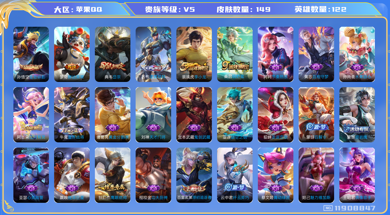 - PX_2103335-实名: 可修改 贵族等级: V8 英雄数: 123 皮肤数: 272 荣耀水晶: 杀手不太冷 传说皮: 黄金狮子座,云鹰飞将,炽阳神光,一念神魔,云霓雀翎,时之恋人-刘备,花朝如约,无双飞将,记忆之芯,灼幽烈阳,小动物乐团,玄雷天君 限定皮: 遇见飞天,李小龙,游园惊梦,青春决赛季,冰霜恋舞曲,大圣娶亲,高山流水,猪悟能,匿光追影者,傲雪梅枪,启示之音,五谷丰年,山海·碧波行