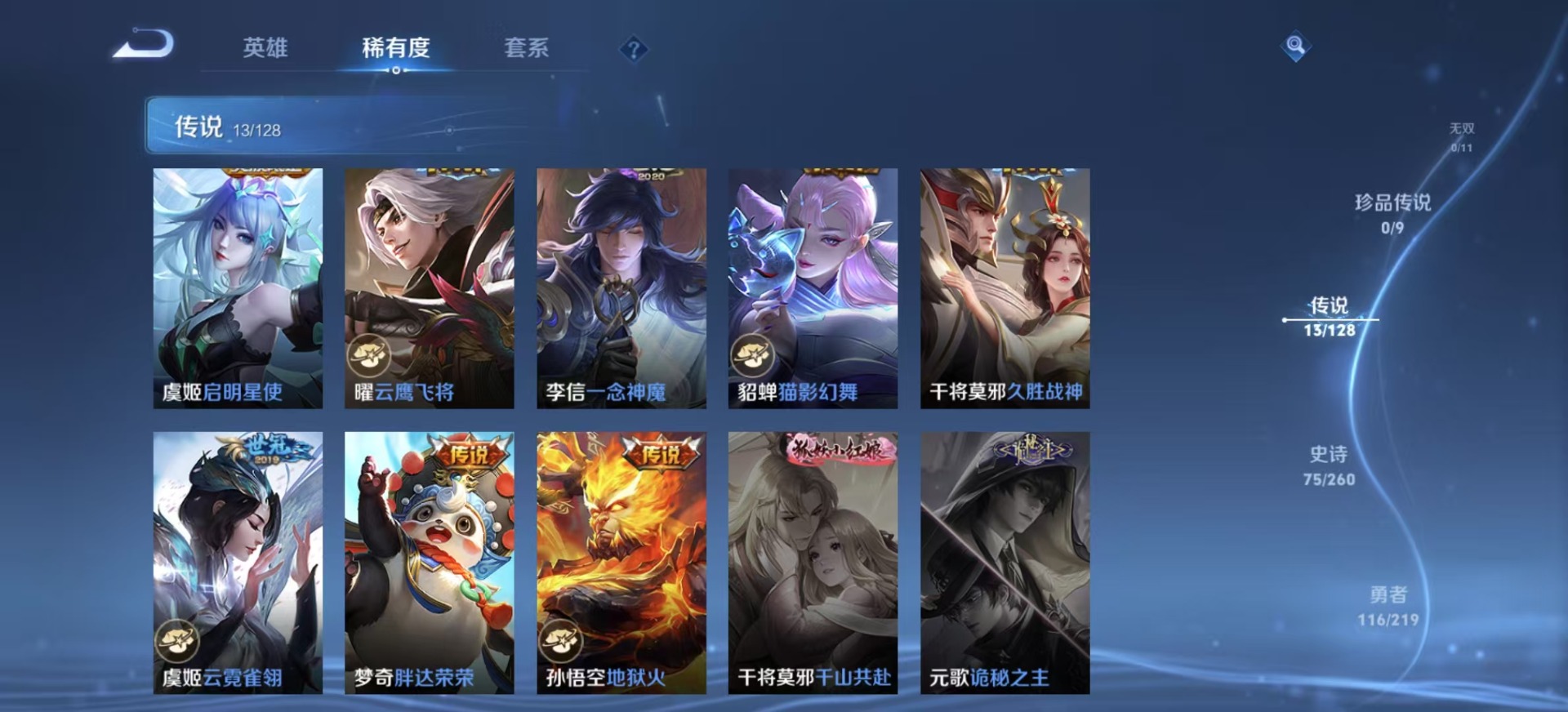 - [11603347]V7 1典藏 11传说 125英雄 225皮肤 可修改实名 优质装备:幻阙歌(貂蝉典藏),黄金射手座,云鹰飞将(小将军),仲夏夜之梦(大飞蛾),游龙清影(小青龙),超时空战士-狄仁杰,山海·炽霜斩(李信年限),炽翼辉光(娃娃菜牛角包) 传说皮:幻光神枪 珍宝阁皮:胡桃夹子,女武神,玩趣恶龙 限定皮:愿照·九州拓(澜年限),鸣野蒿,遇见飞天,诗剑行,五谷丰年,李小龙,朱雀志(守约年限),匿光追影者,山海·玄木吟(马可年限) 史诗皮:星界战将,百相守梦-黄忠,紫霞仙子,苍穹之光,电玩小子(小书包),白龙吟,黄金分割率,特工魅影,千年之狐,江河有灵,蒙恬荣光圣徽,冰冠公主,偶像歌手,电玩·爆裂旋风,末日机甲-吕布,猫狗日记-孙策,猫狗日记-大乔,乱世虎臣,节奏热浪,女仆咖啡,摇滚巨星,水果甜心,星夜王子,功夫厨神,德古拉伯爵,暗隐猎兽者,鬼剑武藏,心灵战警,舞动绿茵,纤云弄巧,缤纷独角兽,乘风破浪,逐浪之夏,水晶猎龙者,曙光守护者,箭羽风息,金属风暴,原初追逐者,圣诞狂欢,圣诞恋歌,鹰眼统帅,王者之锤,暗夜贵公子,魅力维加斯,黎明之约,无心,未来纪元-赵云