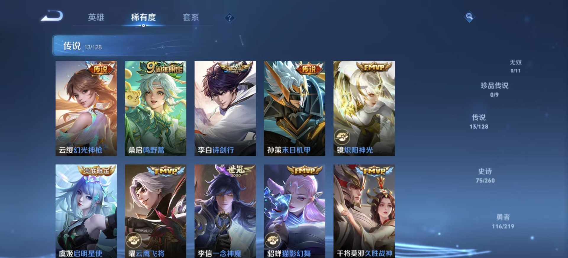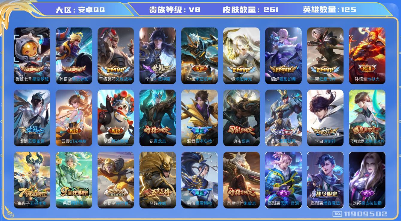 [11909502]V8 2典藏 13传说 125英雄 261皮肤 可修改实名 优质装备:星空梦想(太空人),全息碎影(猴子典藏),云鹰飞将(小将军),猫影幻舞,久胜战神,炽阳神光,一念神魔,云霓雀翎,地狱火,胖达荣荣,末日机甲-孙策,涂山容容 传说皮:幻光神枪 珍宝阁皮:优雅恋人,蔷薇恋人 限定皮:逐霄战戟,鸣野蒿,傲雪梅枪,神威(电光马子),诗剑行,五谷丰年,青龙志(铠年限),岱宗(典韦年限),朱雀志(守约年限),孙行者,百木心枪,山海·玄木吟(马可年限) 史诗皮:龙之律动,破空之剑,琥珀纪元伽罗,蔬乡物语(鲁班七号),百相守梦-黄忠,紫霞仙子,特工魅影,江河有灵,百解令(蒙犽),高渐离燃音魔法,无限星赏官,冰冠公主,偶像歌手,电玩·爆裂旋风,百相守梦(刘备),龙骑士(小龙虾),末日机甲-吕布,猫狗日记-孙策,乱世虎臣,节奏热浪,修罗,女仆咖啡,摇滚巨星,水果甜心,绅士熊喵,天才门将,星夜王子,心灵骇客,功夫厨神,德古拉伯爵,暗隐猎兽者,幽灵船长,鬼剑武藏,心灵战警,乐园奇幻夜,天秀·启明,地狱岩魂,纤云弄巧,拒霜思,缤纷独角兽,乘风破浪,曙光守护者,箭羽风息,金属风暴,圣诞狂欢,圣诞恋歌,鹰眼统帅,魅力维加斯,天秀·音浪,无心,未来纪元-赵云