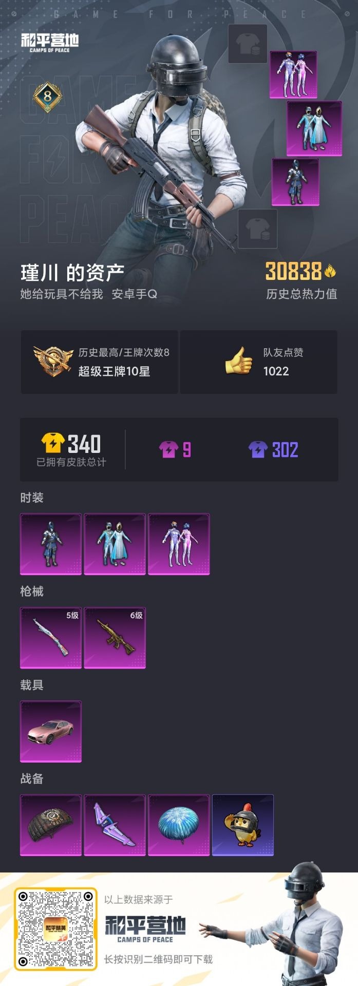 - PX_2093675- 苹果微信-6王牌印记-0粉装-0特效枪-0载具-9331热力值-57套装-40枪皮-0卓越印记-0传奇印记 【1热门】,火箭少女101, 【2稀有紫装】,浪漫天命,雪山精英, 【57稀有时装】,火箭少女101,SS33特训,浪漫天命,雪山精英,光子十周年,S5赛事,S6赛事,蓝色运动,5.56爱好者,白色伏地魔,SS9特训,酒红色名流,红剪之缘,酷萌兔限定,骑行爱好者,S