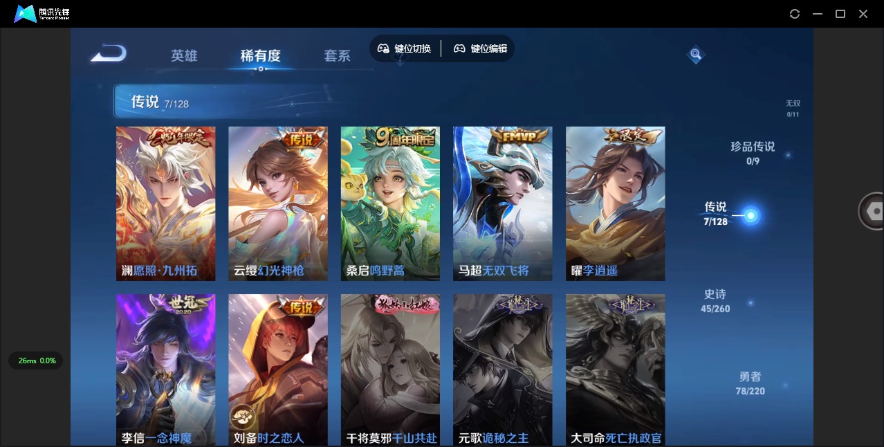 - PX_2070738-53 安卓QQ/至尊星耀/327皮肤/124英雄/1典藏/0珍品无双/1无双/3珍品传说/20传说/88史诗/9稀有英雄 【3 珍品传说】怪盗基德 马可波罗,时之奇旅 孙策,器灵·落星盏 嫦娥, 【1 典藏皮肤】弑枪猎影 韩信, 【1 无双皮肤】器灵·螭龙剑 曜, 【20 传说皮肤】胖达荣荣 梦奇,启明星使 虞姬,云霓雀翎 虞姬,无双飞将 马超,凤求凰 李白,时雨天司 诸葛亮