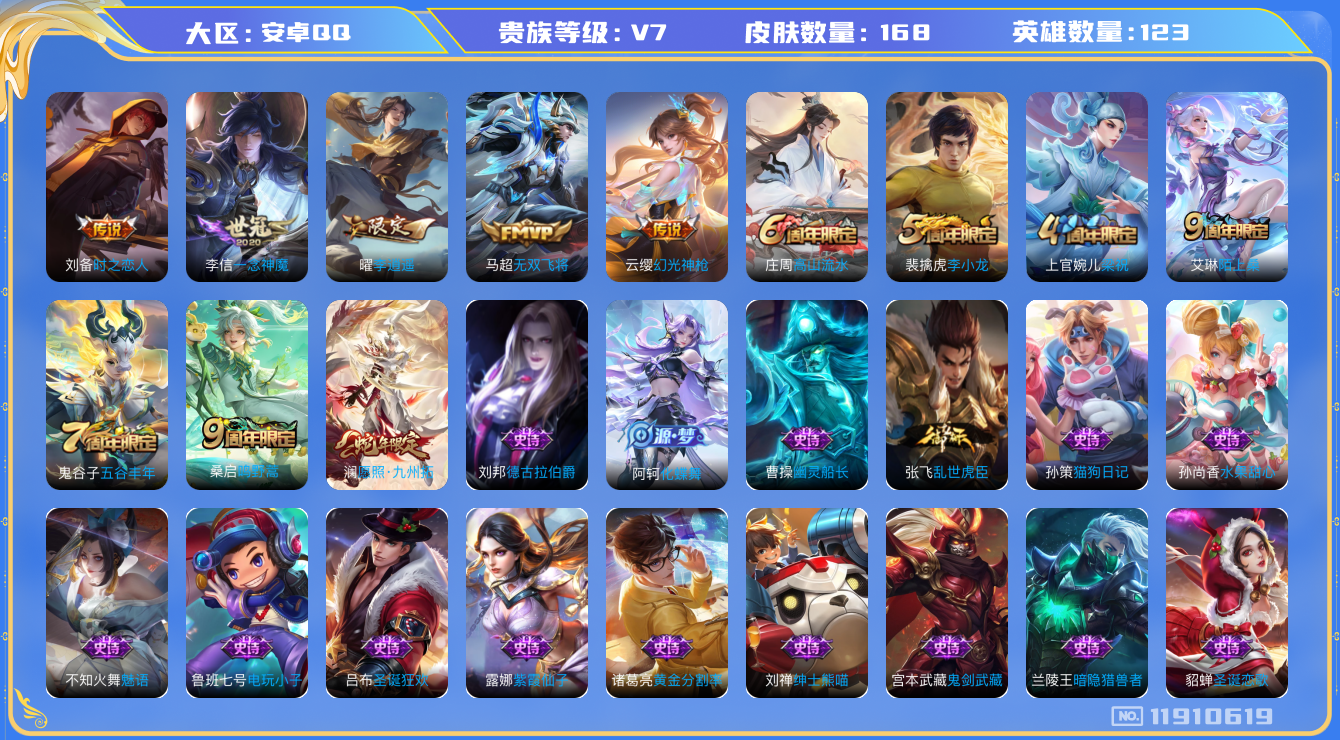 [11910619]V7 7传说 123英雄 168皮肤 可修改实名 优质装备:一念神魔,李逍遥,时之恋人-刘备(电焊工),无双飞将 传说皮:幻光神枪 珍宝阁皮:妄想食味,优雅恋人 限定皮:愿照·九州拓(澜年限),陌上桑,鸣野蒿,高山流水,五谷丰年,梁祝,李小龙 史诗皮:化蝶舞,谪仙醉月,东方月初,百相守梦-百里守约,星界特工,遇见神鹿,紫霞仙子,电玩小子(小书包),黄金分割率,魅语,偶像歌手,猫狗日记-孙策,乱世虎臣,修罗,女仆咖啡,水果甜心,绅士熊喵,星夜王子,心灵骇客,德古拉伯爵,暗隐猎兽者,幽灵船长,鬼剑武藏,逐浪之夏,水晶猎龙者,热力回旋,金属风暴,圣诞狂欢,圣诞恋歌,鹰眼统帅,魅力维加斯,赏金猎手