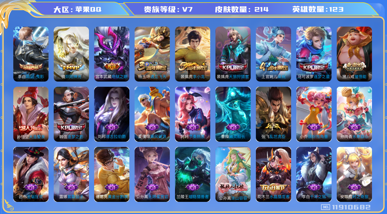 [11910682]V7 1典藏 2传说 123英雄 214皮肤 可修改实名 优质装备:鸣剑·曳影,炽阳神光,地狱之眼,涂山容容 珍宝阁皮:优雅恋人 限定皮:遇见飞天,梁祝,天狼狩猎者,逐梦之星,李小龙,逐梦之影,猪悟能,大圣娶亲 史诗皮:紫霞仙子,白龙吟,黄金分割率,千年之狐,无限星赏官,冰冠公主,偶像歌手,乱世虎臣,节奏热浪,修罗,水果甜心,时之奇旅-安琪拉,功夫厨神,德古拉伯爵,暗隐猎兽者,幽灵船长,舞动绿茵,纤云弄巧,繁星吟游(呼啦呼啦),拒霜思,缤纷独角兽,乘风破浪,水晶猎龙者,金属风暴,原初追逐者,圣诞狂欢,鹰眼统帅,黎明之约