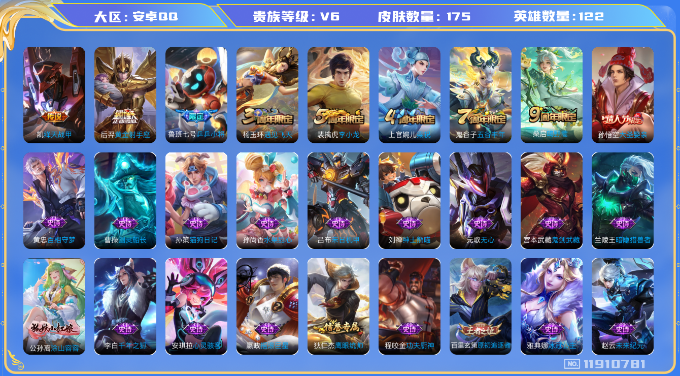 [11910781]V6 3传说 122英雄 175皮肤 可修改实名 优质装备:黄金射手座,绛天战甲(鸡嘴战神),涂山容容 珍宝阁皮:胡桃夹子,蔷薇恋人 限定皮:鸣野蒿,遇见飞天,五谷丰年,梁祝,李小龙,大圣娶亲,乒乒小将 史诗皮:龙之律动,百相守梦-黄忠,白龙吟,特工魅影,千年之狐,冰冠公主,龙骑士(小龙虾),末日机甲-吕布,猫狗日记-孙策,摇滚巨星,水果甜心,绅士熊喵,心灵骇客,功夫厨神,暗隐猎兽者,幽灵船长,鬼剑武藏,纤云弄巧,拒霜思,金属风暴,原初追逐者,鹰眼统帅,魅力维加斯,无心,未来纪元-赵云
