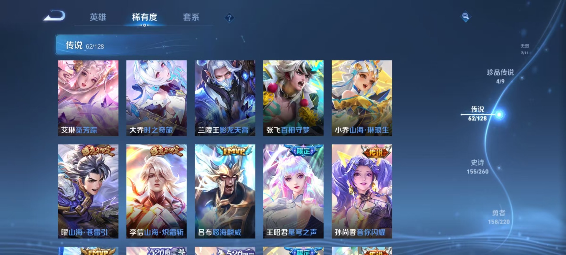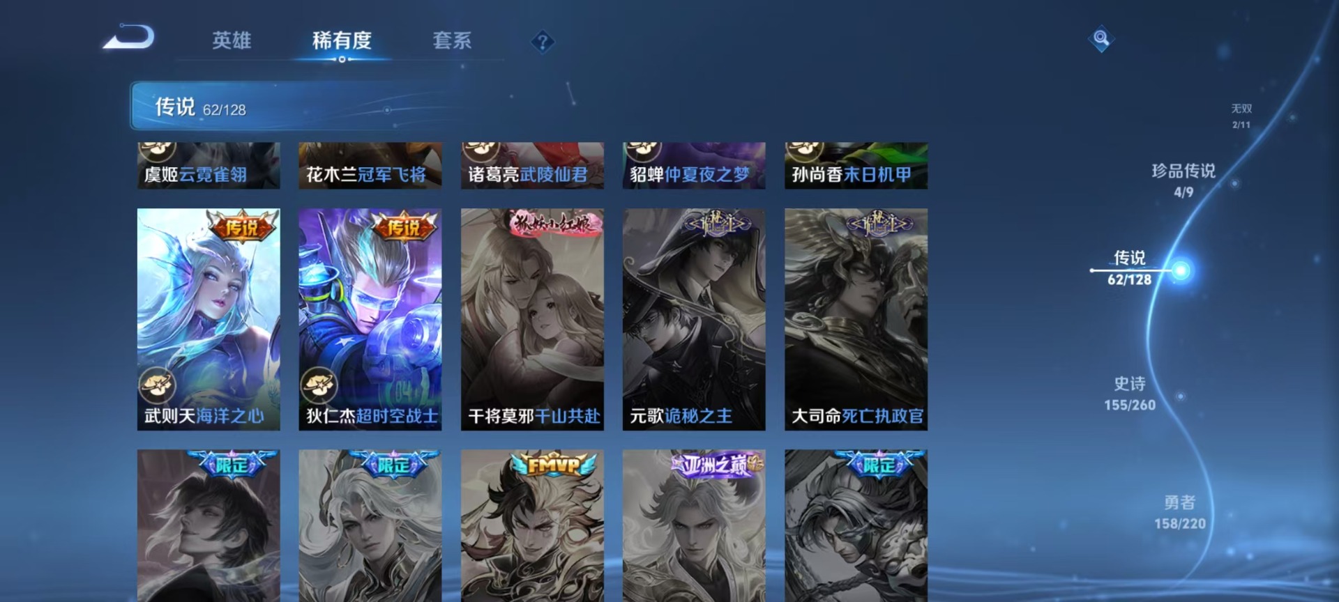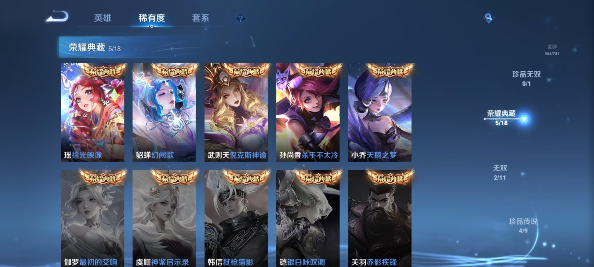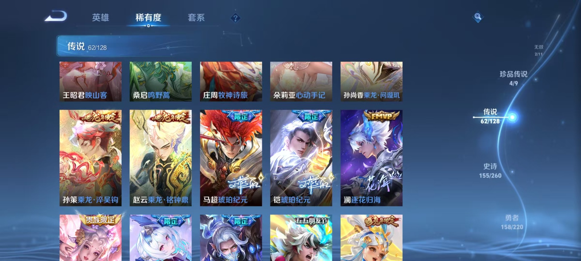 沈梦溪大漠名商,苏烈千军破阵,典韦蓝屏警告,达摩沙漠行僧,项羽苍威无极,吕布猎兽之王,镜青焰无极,元歌云间偶戏,兰陵王金庭之子,裴擒虎擒涛扼浪,鲁班大师探海日志,马可波罗暗影游猎,鬼谷子原初探秘者,张良古海寻踪,桑启海盐诗旅,狄仁杰万华元夜,程咬金演武夺筹,李元芳银河之约,李元芳云中旅人,钟馗驱傩正仪