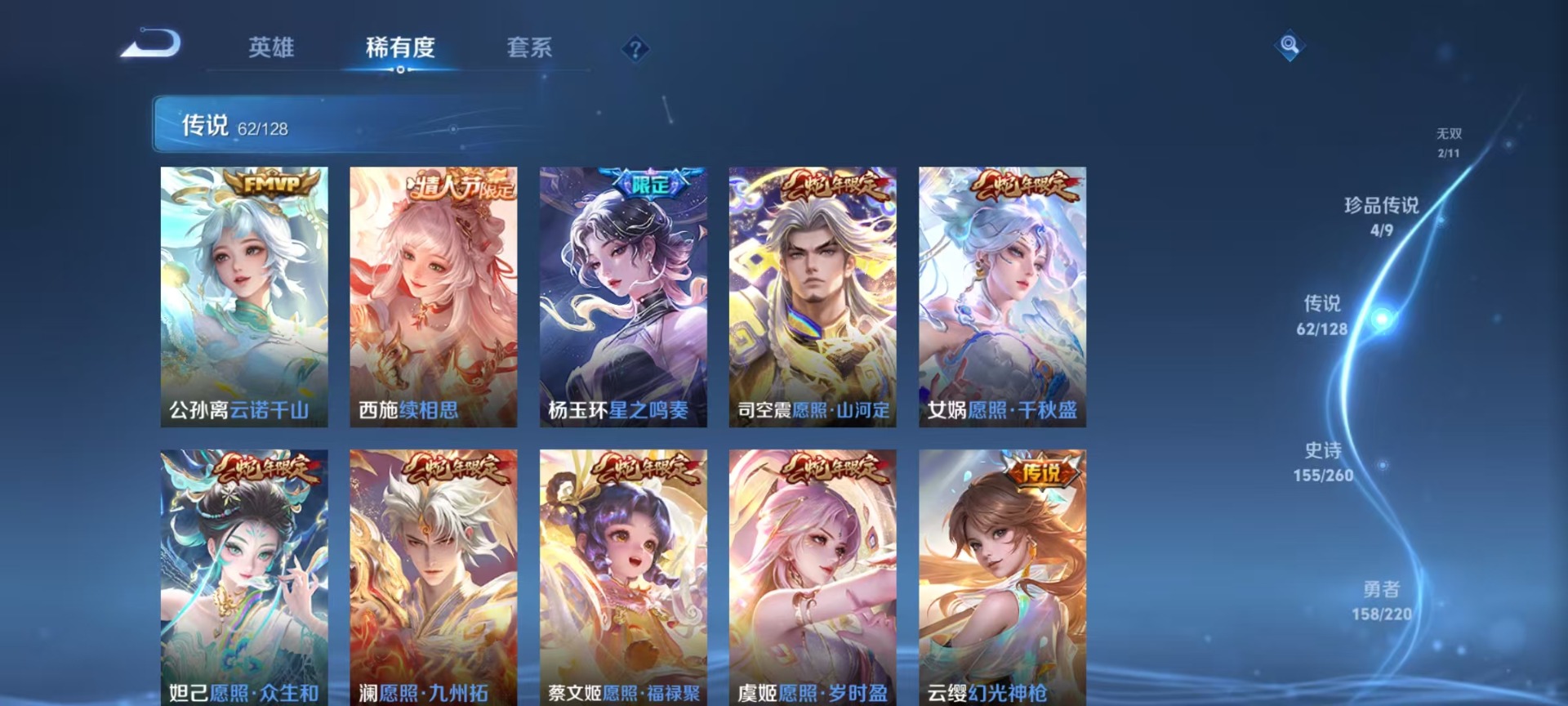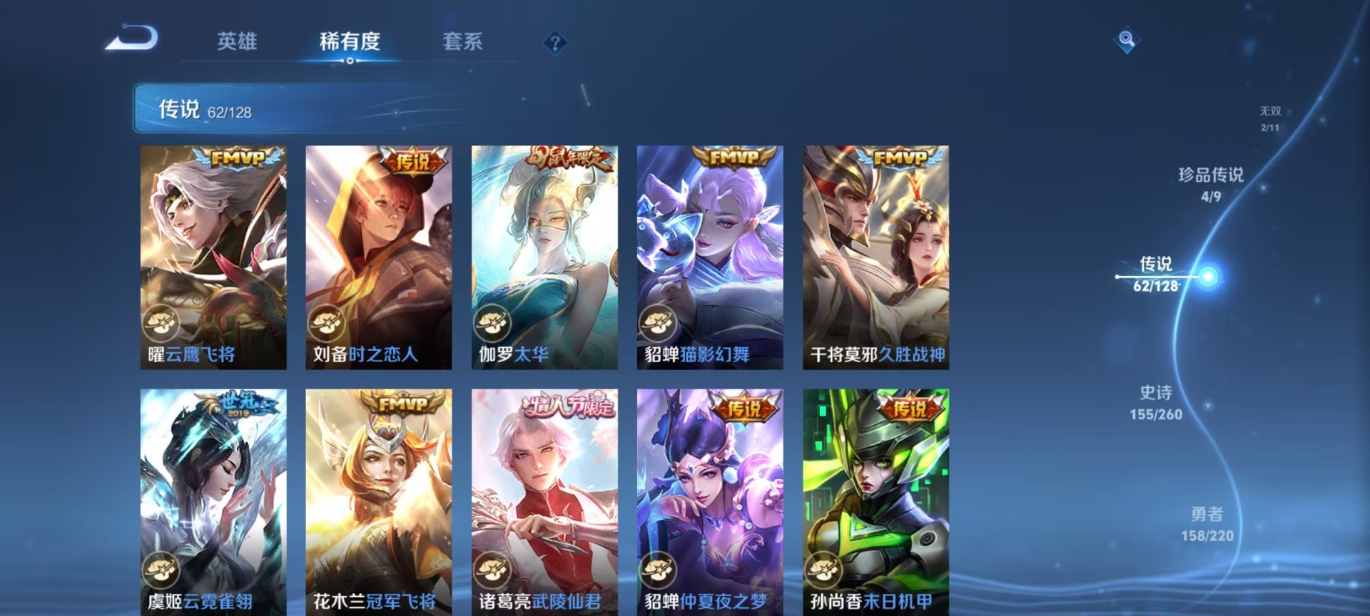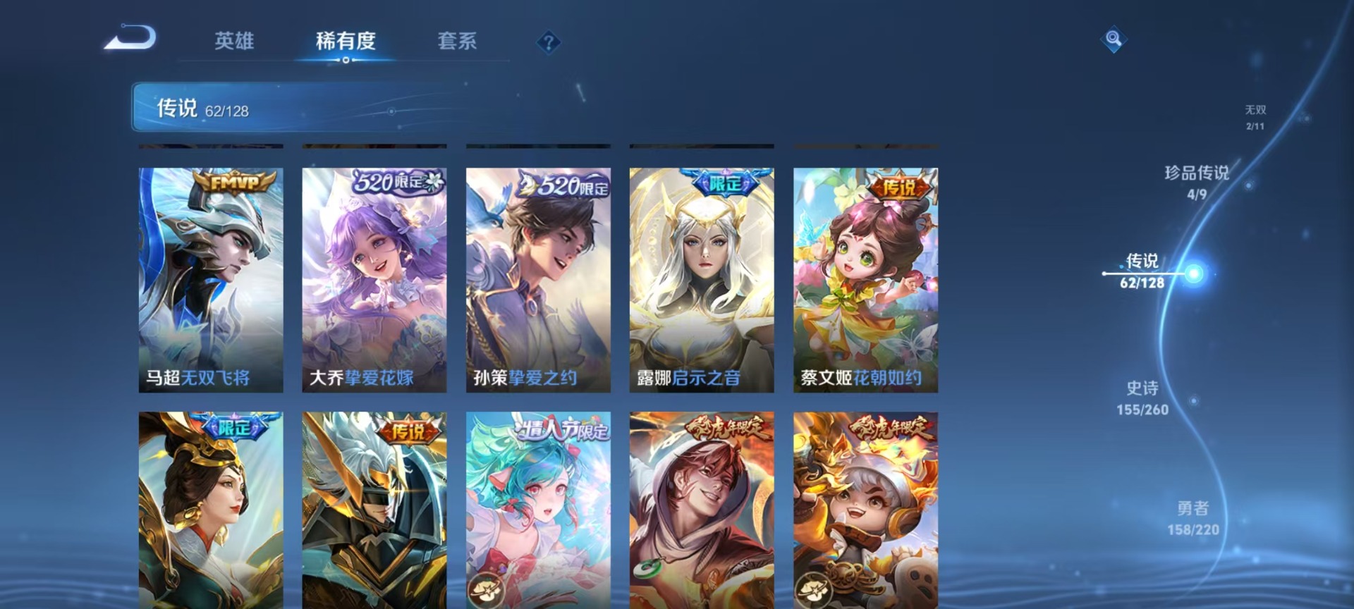 大乔白鹤梁神女,甄姬幽恒,甄姬女儿国国王,廉颇寅虎·御盾,伽罗天狼溯光者,伽罗太华,赵云百木心枪,孙膑寅虎·展翼,小乔纯白花嫁,孙尚香异界灵契,牛魔奔雷神使,鲁班七号乒乒小将,鲁班七号寅虎·瑞焰,后羿如梦令,露娜启示之音,露娜一生所爱,庄周玄嵩,镜匿光追影者,诸葛亮时雨天司,杨玉环寅虎·心曲,公孙离玉兔公主,公孙离蜜橘之夏,司空震愿照·山河定,兰陵王影龙天霄,鲁班大师匿光启智者,裴擒虎天狼狩猎者,裴擒虎寅虎·赤拳,东皇太一逐梦之光,上官婉儿天狼绘梦者,花木兰瑞麟志,花木兰青春决赛季,安琪拉魔法小厨娘,马可波罗山海·玄木吟,艾琳陌上桑,西施至美·乘鲤谣,桑启鸣野蒿,女娲补天,女娲愿照·千秋盛,芈月白晶晶,马超神威,云中君时之祈愿,妲己时之彼端,妲己愿照·众生和,韩信傲雪梅枪,韩信飞衡,百里守约朱雀志,蔡文姬奇迹圣诞,蔡文姬愿照·福禄聚,瑶时之祈愿,瑶山海·碧波行,澜愿照·九州拓,虞姬愿照·岁时盈,妲己热情桑巴,嫦娥如梦令,王昭君星穹之声,王昭君映山客