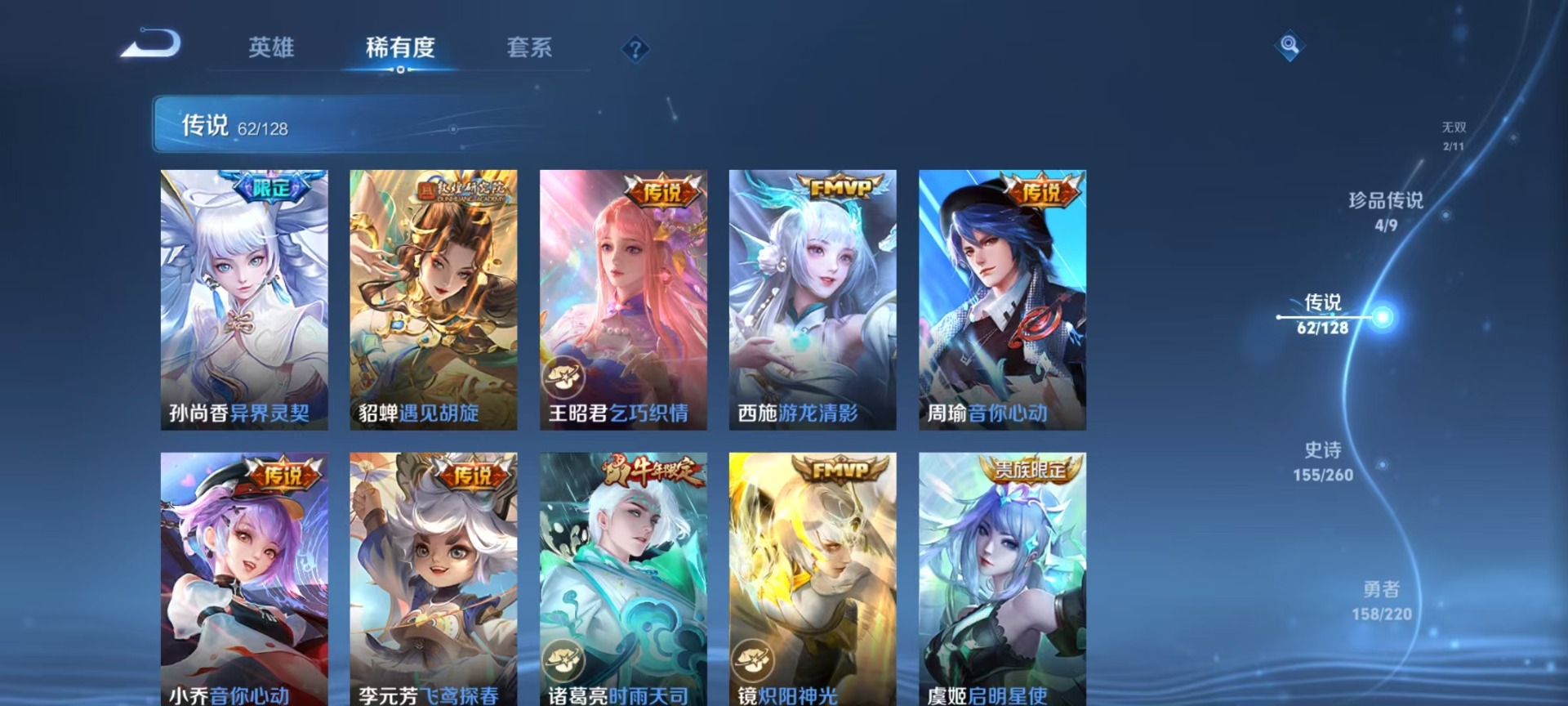 大乔挚爱花嫁,大乔时之奇旅,刘备时之恋人,铠琥珀纪元,赵云乘龙·铭钟鼎,张飞百相守梦,干将莫邪久胜战神,小乔音你心动,孙尚香音你闪耀,孙策末日机甲,孙策挚爱之约,孙策乘龙·淬吴钩,孙尚香乘龙·问璇玑,王昭君乞巧织情,庄周牧神诗旅,镜炽阳神光,朵莉亚心动手记,周瑜音你心动,杨玉环星之鸣奏,貂蝉遇见胡旋,貂蝉猫影幻舞,艾琳觅芳踪,西施游龙清影,西施续相思,曜云鹰飞将,马超琥珀纪元,马超无双飞将,李元芳飞鸢探春,澜逐花归海,蔡文姬花朝如约,虞姬云霓雀翎,云缨幻光神枪