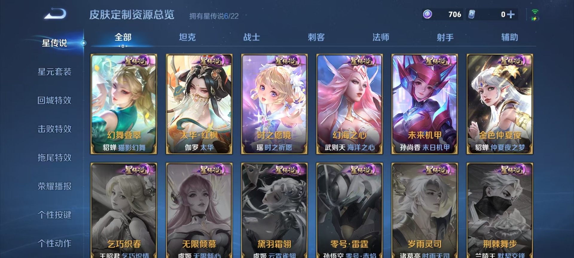 大乔白蛇,大乔猫狗日记,高渐离天秀·音浪,高渐离燃音魔法,大乔乘龙·忆丹青,海诺心动手记,刘邦德古拉伯爵,夏侯惇乘风破浪,阿轲暗夜猫娘,阿轲节奏热浪,沈梦溪匿光破解者,铠曙光守护者,曹操幽灵船长,廉颇地狱岩魂,伽罗箭羽风息,伽罗琥珀纪元,小乔缤纷独角兽,小乔青蛇,孙尚香时之恋人,孙策猫狗日记,不知火舞魅语,鲁班七号电玩小子,吕布圣诞狂欢,吕布末日机甲,露娜紫霞仙子,镜玫瑰异探,诸葛亮黄金分割率,司马懿暗渊魔法,刘禅天才门将,刘禅绅士熊喵,宫本武藏鬼剑武藏,杨玉环银翎春语,公孙离无限星赏官,兰陵王暗隐猎兽者,貂蝉圣诞恋歌,貂蝉唤灵魅影,花木兰水晶猎龙者,李白千年之狐,夏洛特永昼,上官婉儿群星魔术团,安琪拉心灵骇客,安琪拉乘龙·聚宝船,蒙犽百解令,安琪拉时之奇旅,艾琳奇遇舞章,杨戬天秀·启明,白起星夜王子,西施诗语江南,亚瑟心灵战警,张良千筹问战,嬴政摇滚巨星,嬴政暗夜贵公子,程咬金功夫厨神,百里玄策热力回旋,雅典娜冰冠公主,雅典娜黎明之约,李元芳逐浪之夏,百里守约特工魅影,墨子龙骑士,墨子金属风暴,蔡文姬舞动绿茵,瑶遇见神鹿,澜赏金猎手,娜可露露晚萤,王昭君偶像歌手,嫦娥拒霜思,钟馗乐园奇幻夜,橘右京修罗