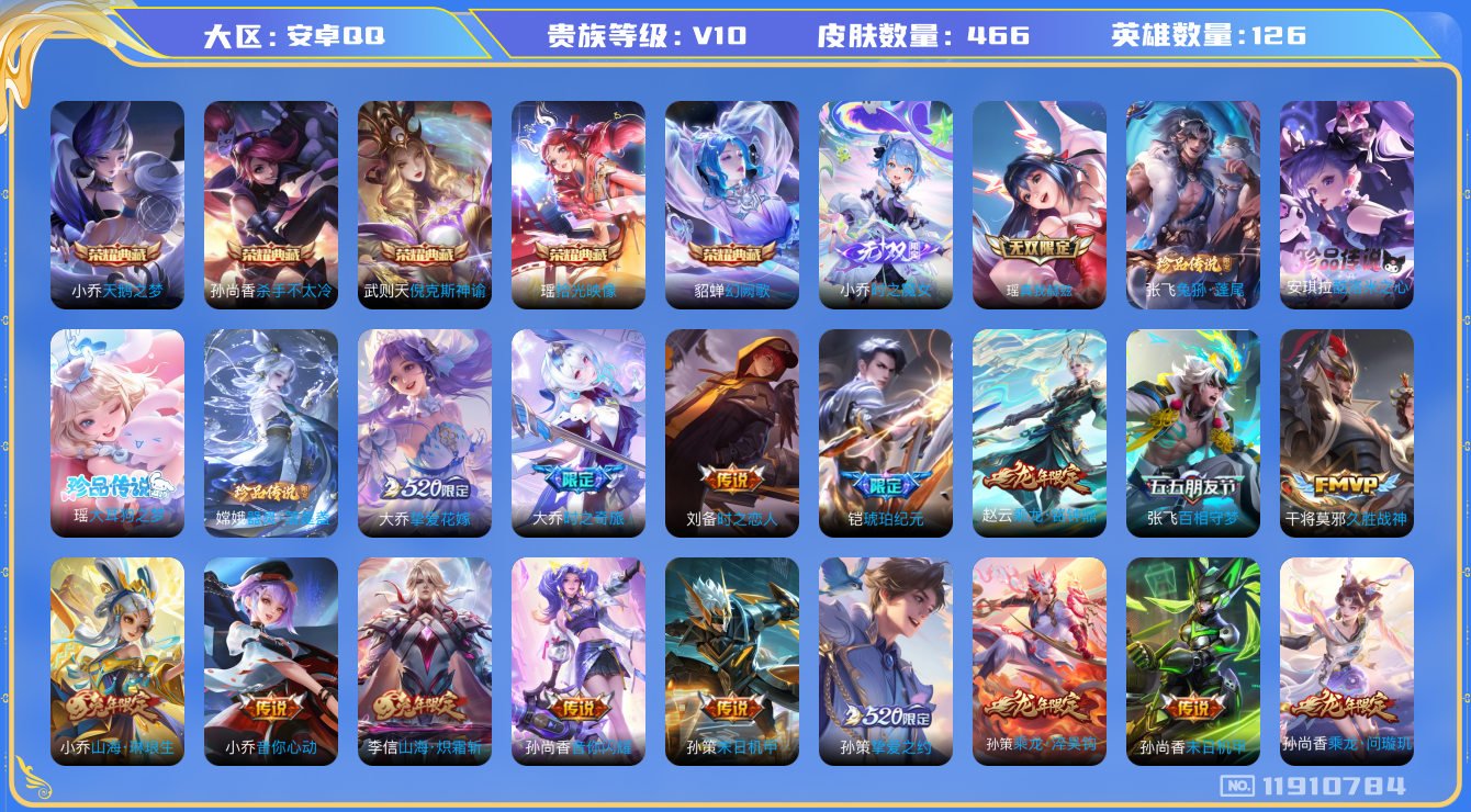 [11910784]V10 5典藏 2无双 4珍品传说 62传说 126英雄 466皮肤 典藏英雄武则天 可修改实名 优质装备:天鹅之梦(小乔典藏),倪克斯神谕(宇宙婆娘),杀手不太冷,幻阙歌(貂蝉典藏),真我赫兹(瑶)(瑶无双),小乔时之魔女(小乔无双),拾光映像(瑶典藏),器灵·落星盏,酷洛米之心,大耳狗之梦,冠军飞将,云鹰飞将(小将军),猫影幻舞,久胜战神,炽阳神光,云霓雀翎,末日机甲-孙尚香(绿蚂蚱),仲夏夜之梦(大飞蛾),音你心动-小乔,海洋之心,飞鸢探春,音你心动-周瑜,乞巧织情,时之恋人-刘备(电焊工),游龙清影(小青龙),超时空战士-狄仁杰,遇见胡旋,末日机甲-孙策,花朝如约(花篮子),挚爱之约,挚爱花嫁,无双飞将,音你闪耀(rap皮),山海·炽霜斩(李信年限),山海·琳琅生(小乔年限),山海·苍雷引(电光曜子),百相守梦(张飞),大乔-时之奇旅,澜逐花归海,艾琳觅芳踪,琥珀纪元铠,琥珀纪元马超,朵莉亚心动手记,牧神诗旅,涂山容容 珍品传说:兔狲·蓬尾 传说皮:乘龙·问璇玑(孙尚香年限),乘龙·铭钟鼎(赵云年限),乘龙·淬吴钩(孙策年限),云诺千山,续相思,星之鸣奏,幻光神枪 珍宝阁皮:妄想食味,女武神,玩趣恶龙 限定皮:愿照·九州拓(澜年限),愿照·福禄聚(蔡文姬年限),愿照·岁时盈(虞姬年限),愿照·山河定(司空震年限),愿照·众生和(妲己年限),愿照·千秋盛(女娲年限),逐霄战戟,映山客,陌上桑,鸣野蒿,太华(伽罗年限),武陵仙君(小桃花),异界灵契(白毛香),傲雪梅枪,补天,寅虎·展翼(孙膑年限),星穹之声,时之彼端,白鹤梁神女,魔法小厨娘,白晶晶,时雨天司(水龙头),神威(电光马子),飞衡(韩信年限),玄嵩(庄周年限),山海·碧波行(瑶年限),瑞麟志(木兰年限),至美·乘鲤谣,影龙天霄,遇见飞天,高山流水,怒海麟威,五谷丰年,幽恒(沐浴露),游园惊梦,天狼狩猎者,天狼溯光者,奔雷神使(牛魔年限),天狼绘梦者,逐梦之光,朱雀志(守约年限),如梦令-嫦娥,如梦令-后羿,奇迹圣诞,纯白花嫁,一生所爱,青春决赛季,乒乒小将,蜜橘之夏,热情桑巴,匿光追影者,女儿国国王,寅虎·御盾(廉颇年限),寅虎·瑞焰(虎皮蛋子),寅虎·心曲(虎婆),寅虎·赤拳(老虎年限),时之祈愿-云中君,时之祈愿-瑶(瑶传限),百木心枪,玉兔公主,启示之音,匿光启智者,山海·玄木吟(马可年限)