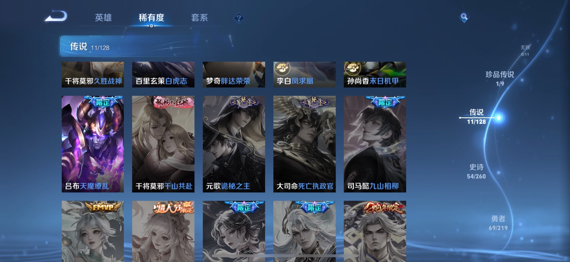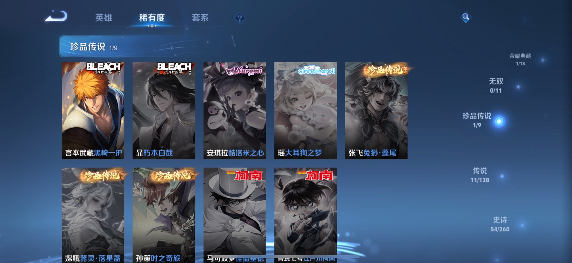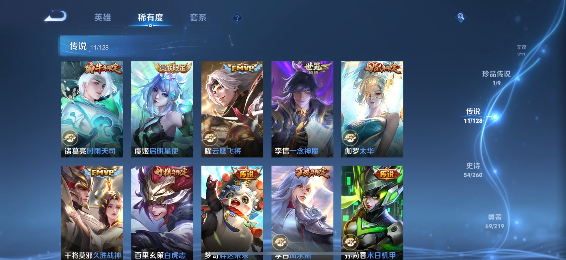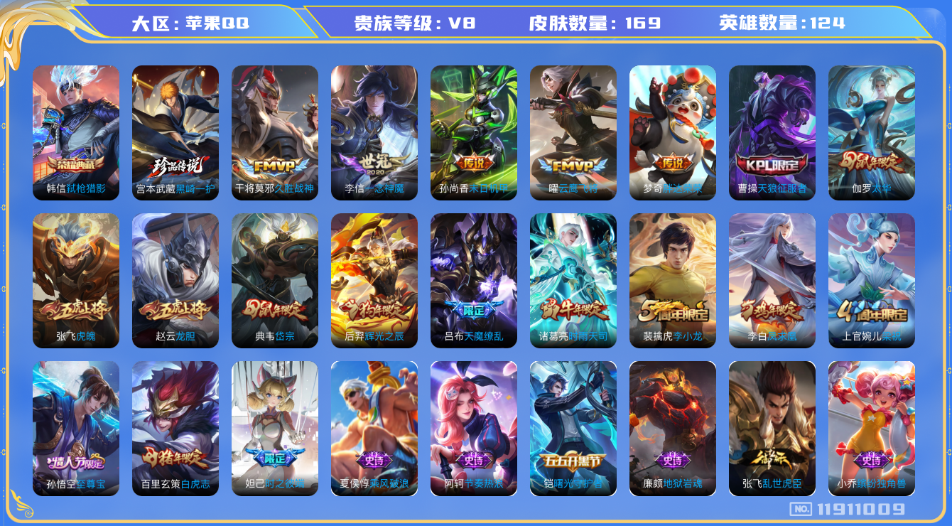 [11911009]V8 1典藏 1珍品传说 11传说 124英雄 169皮肤 可修改实名 优质装备:弑枪猎影(韩信典藏),黑崎一护,云鹰飞将(小将军),久胜战神,一念神魔,末日机甲-孙尚香(绿蚂蚱),胖达荣荣 珍宝阁皮:玩趣恶龙 限定皮:至尊宝,白虎志(电光耗子),凤求凰(白切鸡),太华(伽罗年限),时之彼端,时雨天司(水龙头),梁祝,龙胆,岱宗(典韦年限),虎魄,天狼征服者,李小龙,辉光之辰,天魔缭乱 史诗皮:鸭鸭历险记-刘禅,龙之律动,紫霞仙子,黄金分割率,特工魅影,千年之狐,魅语,无限星赏官,冰冠公主,晚萤,龙骑士(小龙虾),猫狗日记-孙策,时之恋人-孙尚香,乱世虎臣,节奏热浪,修罗,摇滚巨星,水果甜心,星夜王子,心灵骇客,暗隐猎兽者,心灵战警,乐园奇幻夜,舞动绿茵,地狱岩魂,纤云弄巧,繁星吟游(呼啦呼啦),缤纷独角兽,乘风破浪,逐浪之夏,水晶猎龙者,曙光守护者,金属风暴,圣诞恋歌,鹰眼统帅,魅力维加斯