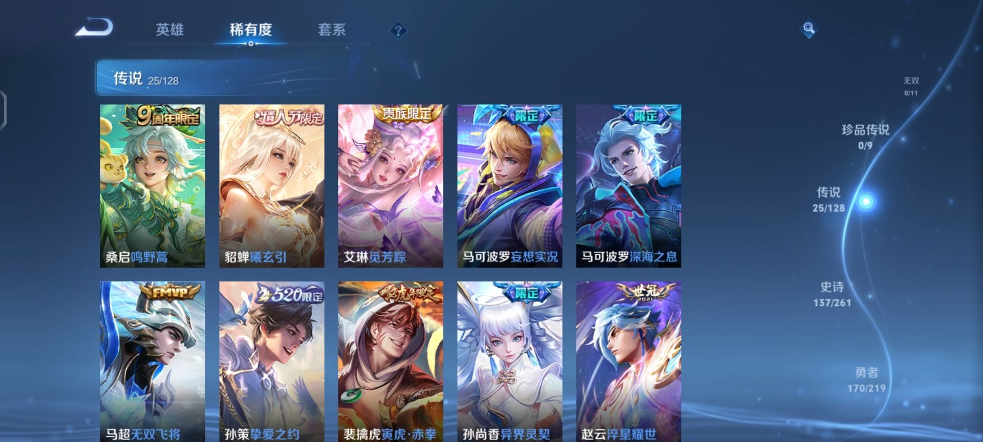 黄忠烈魂,老夫子圣诞老人,哪吒逐梦之翼,甄姬幽恒,廉颇寅虎·御盾,曹操天狼征服者,伽罗太华,张飞虎魄,赵云百木心枪,赵云龙胆,孙膑天狼运算者,干将莫邪冰霜恋舞曲,典韦岱宗,孙尚香异界灵契,牛魔奔雷神使,后羿如梦令,后羿辉光之辰,庄周玄嵩,公孙离玉兔公主,公孙离蜜橘之夏,裴擒虎梅西,貂蝉逐梦之音,裴擒虎李小龙,裴擒虎天狼狩猎者,裴擒虎寅虎·赤拳,东皇太一逐梦之光,上官婉儿梁祝,花木兰青春决赛季,安琪拉魔法小厨娘,马可波罗逐梦之星,马可波罗深海之息,桑启鸣野蒿,猪八戒猪悟能,孙悟空大圣娶亲,孙悟空至尊宝,孙悟空美猴王,百里玄策白虎志,马超神威,雅典娜神奇女侠,赵云引擎之心,妲己时之彼端,韩信飞衡,韩信逐梦之影,百里守约朱雀志,蔡文姬奇迹圣诞,虞姬霸王别姬,妲己热情桑巴,嫦娥如梦令,王昭君凤凰于飞,关羽武圣,关羽冰锋战神