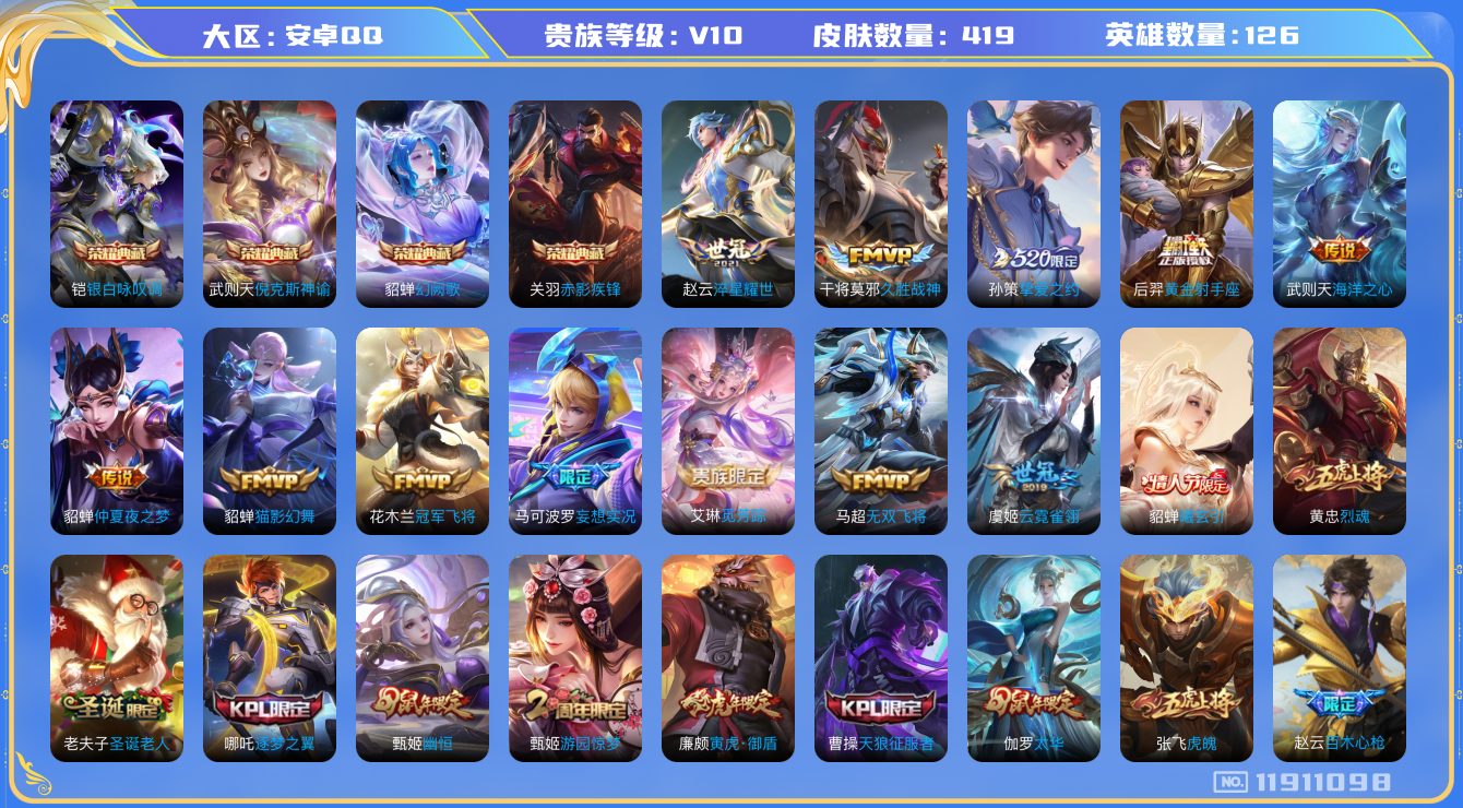 [11911098]V10 4典藏 25传说 126英雄 419皮肤 典藏英雄武则天 可修改实名 优质装备:倪克斯神谕(宇宙婆娘),赤影疾锋,银白咏叹调(倪克斯侍卫),幻阙歌(貂蝉典藏),黄金射手座,冠军飞将,猫影幻舞,久胜战神,云霓雀翎,仲夏夜之梦(大飞蛾),海洋之心,淬星耀世,挚爱之约,无双飞将,妄想实况,艾琳觅芳踪,涂山容容 传说皮:貂蝉曦玄引 珍宝阁皮:胡桃夹子,优雅恋人,蔷薇恋人,女武神,玩趣恶龙 限定皮:鸣野蒿,至尊宝,白虎志(电光耗子),凤求凰(白切鸡),凤凰于飞,太华(伽罗年限),梅西,武陵仙君(小桃花),异界灵契(白毛香),时之彼端,魔法小厨娘,神威(电光马子),飞衡(韩信年限),玄嵩(庄周年限),遇见飞天,高山流水,五谷丰年,冰锋战神,幽恒(沐浴露),武圣,天狼运算者,游园惊梦,梁祝,天狼狩猎者,龙胆,逐梦之翼,逐梦之星,烈魂,岱宗(典韦年限),虎魄,逐梦之音,天狼征服者,奔雷神使(牛魔年限),李小龙,逐梦之影,逐梦之光,朱雀志(守约年限),永曜之星,辉光之辰,如梦令-嫦娥,如梦令-后羿,霸王别姬-虞姬,圣诞老人,奇迹圣诞,猪悟能,大圣娶亲,引擎之心,天魔缭乱,青春决赛季,冰霜恋舞曲,蜜橘之夏,热情桑巴,神奇女侠,美猴王,寅虎·御盾(廉颇年限),寅虎·赤拳(老虎年限),百木心枪,玉兔公主,深海之息(深海大菠萝) 史诗皮:灵蛊蚀心,星界战将,蒙犽顽岩魄,紫霞仙子,苍穹之光,电玩小子(小书包),黄金分割率,特工魅影,千年之狐,永昼,江河有灵,雪夜绮愿(周瑜),魅语,高渐离燃音魔法,蒙恬荣光圣徽,冰冠公主,偶像歌手,晚萤,电玩·爆裂旋风,暗夜猫娘,龙骑士(小龙虾),末日机甲-吕布,猫狗日记-孙策,猫狗日记-大乔,乱世虎臣,节奏热浪,修罗,女仆咖啡,摇滚巨星,水果甜心,绅士熊喵,天才门将,星夜王子,心灵骇客,功夫厨神,德古拉伯爵,暗隐猎兽者,幽灵船长,鬼剑武藏,心灵战警,舞动绿茵,地狱岩魂,纤云弄巧,繁星吟游(呼啦呼啦),拒霜思,缤纷独角兽,乘风破浪,逐浪之夏,月团寄思,水晶猎龙者,曙光守护者,箭羽风息,金属风暴,原初追逐者,圣诞狂欢,圣诞恋歌,鹰眼统帅,王者之锤,暗夜贵公子,魅力维加斯,黎明之约,寅虎·御盾,无心,未来纪元-赵云