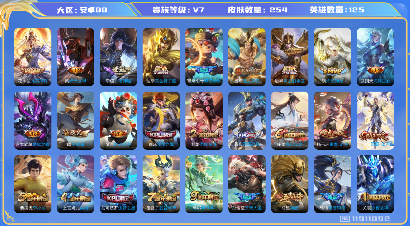[11911092]V7 1典藏 14传说 125英雄 254皮肤 可修改实名 连体和平 优质装备:九霄神辉(木兰典藏),黄金狮子座,黄金射手座,绛天战甲(鸡嘴战神),炽阳神光,一念神魔,海洋之心,地狱之眼,胖达荣荣,李逍遥,遇见神鼓,鲁班七号-时之奇旅,涂山容容 珍宝阁皮:万物之道,蔷薇恋人,女武神 限定皮:愿照·山河定(司空震年限),逐霄战戟,鸣野蒿,傲雪梅枪,神威(电光马子),高山流水,齐天大圣,五谷丰年,冰锋战神,游园惊梦,梁祝,逐梦之翼,逐梦之星,李小龙,寅虎·心曲(虎婆) 史诗皮:化蝶舞,星界战将,龙之律动,百相守梦-周瑜,百相守梦-黄忠,织梦人,电玩小子(小书包),特工魅影,千年之狐,永昼,江河有灵,魅语,百解令(蒙犽),蒙恬荣光圣徽,冰冠公主,电玩·爆裂旋风,末日机甲-吕布,猫狗日记-孙策,女仆咖啡,摇滚巨星,水果甜心,绅士熊喵,星夜王子,功夫厨神,德古拉伯爵,暗隐猎兽者,幽灵船长,鬼剑武藏,地狱岩魂,繁星吟游(呼啦呼啦),拒霜思,缤纷独角兽,乘风破浪,逐浪之夏,月团寄思,水晶猎龙者,热力回旋,箭羽风息,金属风暴,原初追逐者,圣诞恋歌,鹰眼统帅,魅力维加斯,黎明之约,无心,未来纪元-赵云