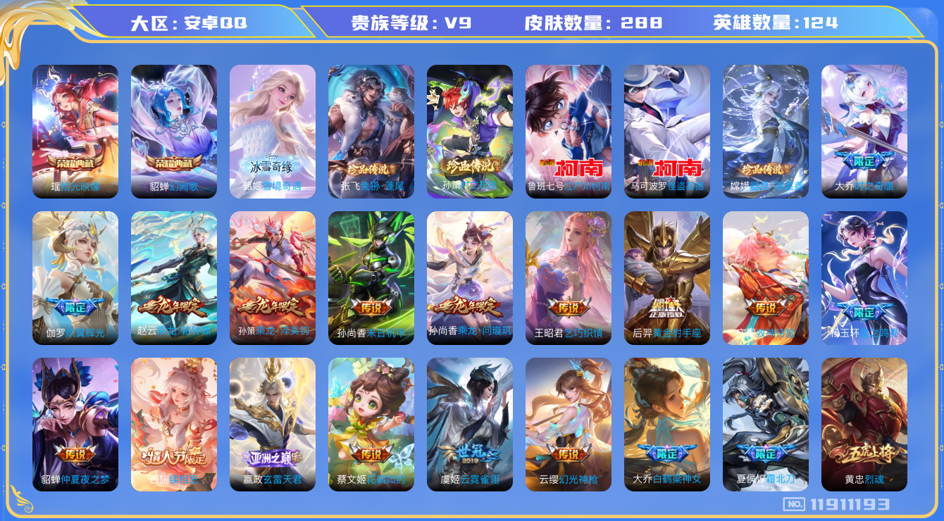 [11911193]V9 2典藏 1无双 5珍品传说 27传说 124英雄 288皮肤 可修改实名 优质装备:幻阙歌(貂蝉典藏),拾光映像(瑶典藏),雪境奇遇-甄姬,江户川柯南,怪盗基德,器灵·落星盏,黄金射手座,云霓雀翎,末日机甲-孙尚香(绿蚂蚱),仲夏夜之梦(大飞蛾),乞巧织情,花朝如约(花篮子),炽翼辉光(娃娃菜牛角包),大乔-时之奇旅,牧神诗旅,玄雷天君,涂山容容 珍品传说:时之奇旅-孙策,兔狲·蓬尾 传说皮:乘龙·问璇玑(孙尚香年限),乘龙·铭钟鼎(赵云年限),乘龙·淬吴钩(孙策年限),续相思,星之鸣奏,幻光神枪 珍宝阁皮:优雅恋人 限定皮:愿照·九州拓(澜年限),愿照·福禄聚(蔡文姬年限),愿照·岁时盈(虞姬年限),愿照·山河定(司空震年限),愿照·众生和(妲己年限),愿照·千秋盛(女娲年限),逐霄战戟,映山客,陌上桑,鸣野蒿,夏侯惇霜北刀,时之彼端,白鹤梁神女,神威(电光马子),遇见飞天,降魔,烈魂,启示之音,神器·万象笔 史诗皮:鸭鸭历险记-刘禅,器灵·浮梦炉,瑰影绮梦,化蝶舞,谪仙醉月,龙之律动,雪豹·霜爪,石田雨龙,百相守梦-周瑜,茶境仙,幻珠鲛人,怒海争锋,撼地雄心,破空之剑,涂山红红,东方月初,蒙犽顽岩魄,埋骨钱,芈月浮光幕影,琥珀纪元伽罗,夜落电台,决胜骁骑,奇遇星旅,蔬乡物语(鲁班七号),乘龙·聚宝船(安琪拉年限),乘龙·忆丹青(大乔年限),百相守梦-百里守约,百相守梦-黄忠,织梦人,遇见神鹿,紫霞仙子,特工魅影,江河有灵,雪夜绮愿(周瑜),浮梦罗烟,完美假期,魅语,百解令(蒙犽),高渐离燃音魔法,无限星赏官,冰冠公主,青蛇,偶像歌手,白蛇,电玩·爆裂旋风,末日机甲-吕布,猫狗日记-孙策,猫狗日记-大乔,乱世虎臣,节奏热浪,女仆咖啡,摇滚巨星,水果甜心,绅士熊喵,心灵骇客,时之奇旅-安琪拉,功夫厨神,德古拉伯爵,暗隐猎兽者,鬼剑武藏,心灵战警,乐园奇幻夜,纤云弄巧,拒霜思,缤纷独角兽,逐浪之夏,水晶猎龙者,曙光守护者,箭羽风息,唤灵魅影,金属风暴,鹰眼统帅,未来纪元-赵云