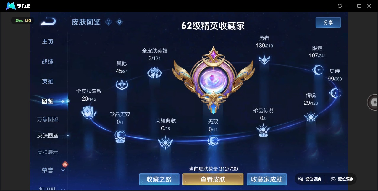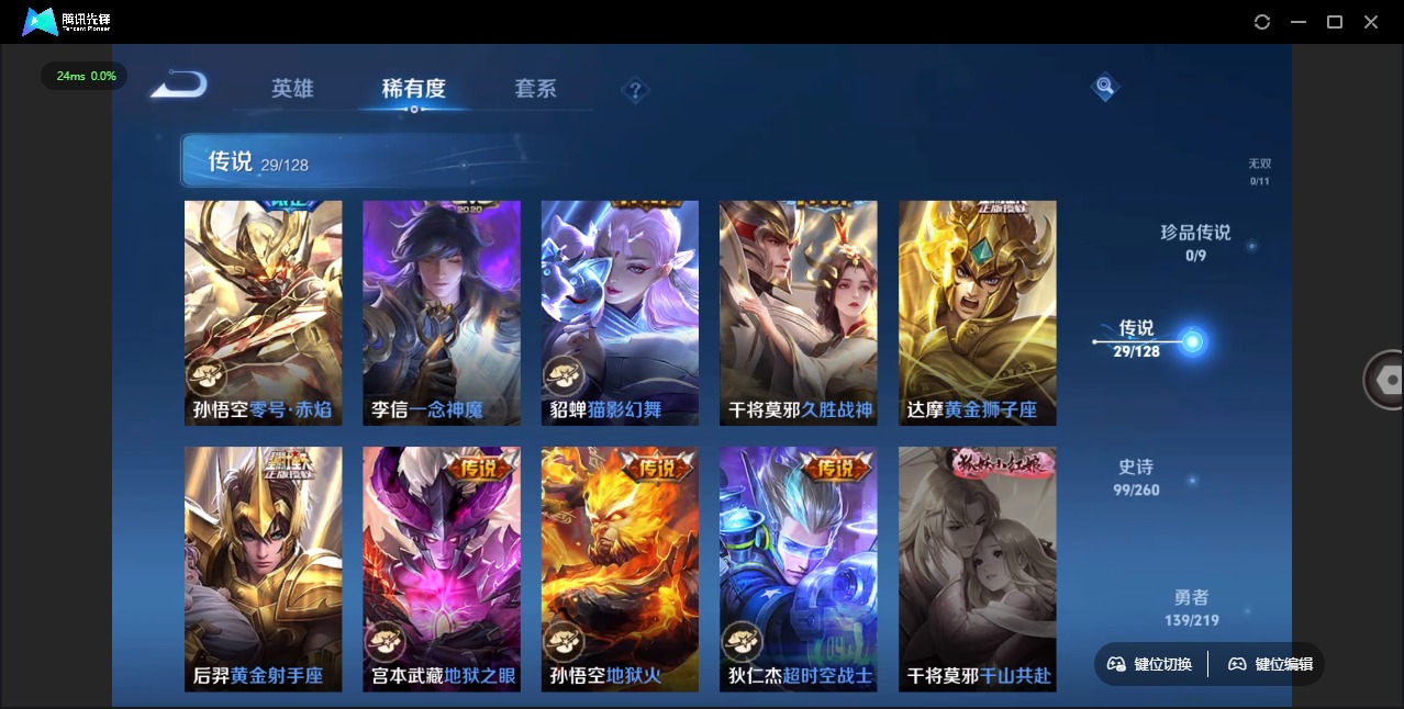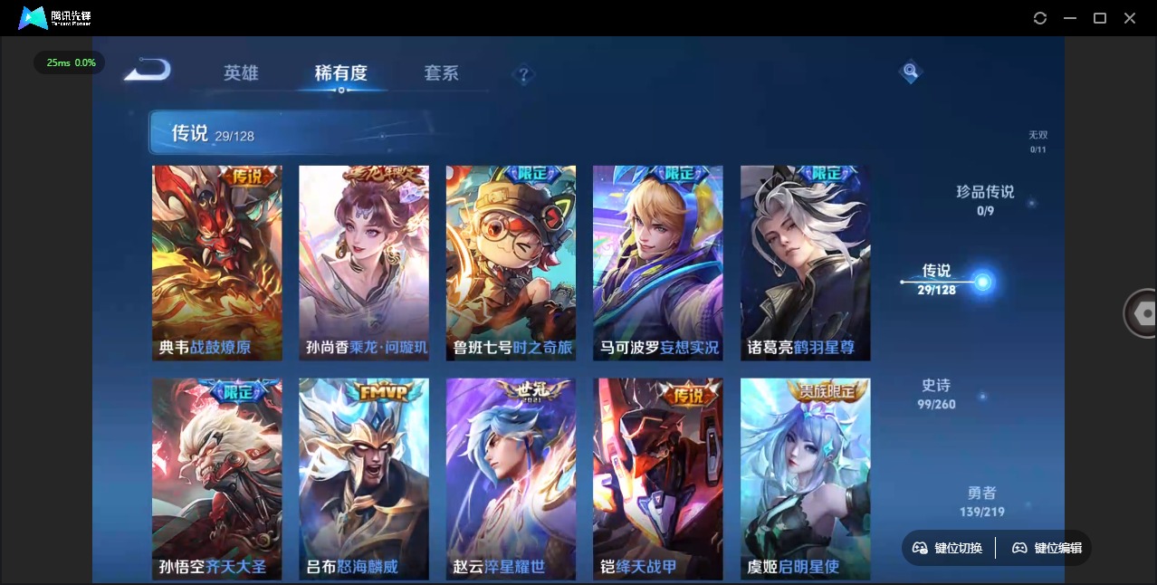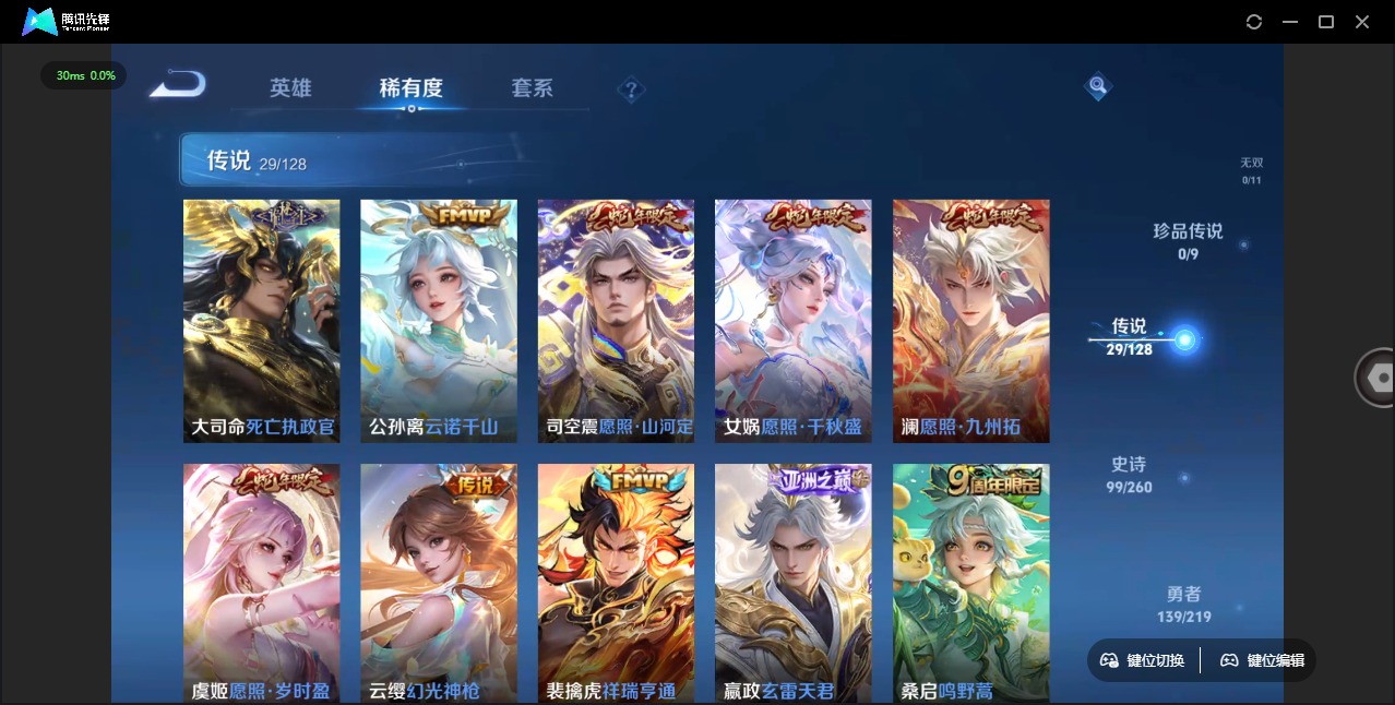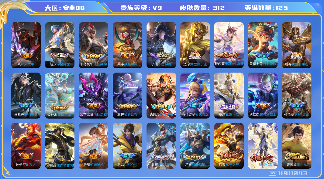 - [11445737]V9 3典藏 20传说 115英雄 176皮肤 可修改实名 优质装备:鸣剑·曳影,全息碎影(猴子典藏),银白咏叹调(倪克斯侍卫),云鹰飞将(小将军),一念神魔,地狱火,地狱之眼,音你心动-周瑜,淬星耀世,超时空战士-狄仁杰,挚爱之约,无双飞将,碎云,神器·狴犴令,山海·炽霜斩(李信年限),记忆之芯(机甲兔) 限定皮:愿照·山河定(司空震年限),时雨天司(水龙头),神威(电光马子),飞衡(韩信年限),诗剑行,齐天大圣,怒海麟威,五谷丰年,烈魂,朱雀志(守约年限),孙行者,深海之息(深海大菠萝),山海·玄木吟(马可年限) 史诗皮:电玩小子(小书包),特工魅影,永昼,电玩·爆裂旋风,偶像歌手,晚萤,冰冠公主,末日机甲-吕布,猫狗日记-孙策,时之恋人-孙尚香,乱世虎臣,节奏热浪,修罗,女仆咖啡,水果甜心,天才门将,星夜王子,心灵骇客,时之奇旅-安琪拉,德古拉伯爵,幽灵船长,鬼剑武藏,舞动绿茵,缤纷独角兽,逐浪之夏,水晶猎龙者,曙光守护者,热力回旋,唤灵魅影,金属风暴,圣诞狂欢,鹰眼统帅,魅力维加斯,赏金猎手,天秀·音浪,千筹问战,无心,玫瑰异探