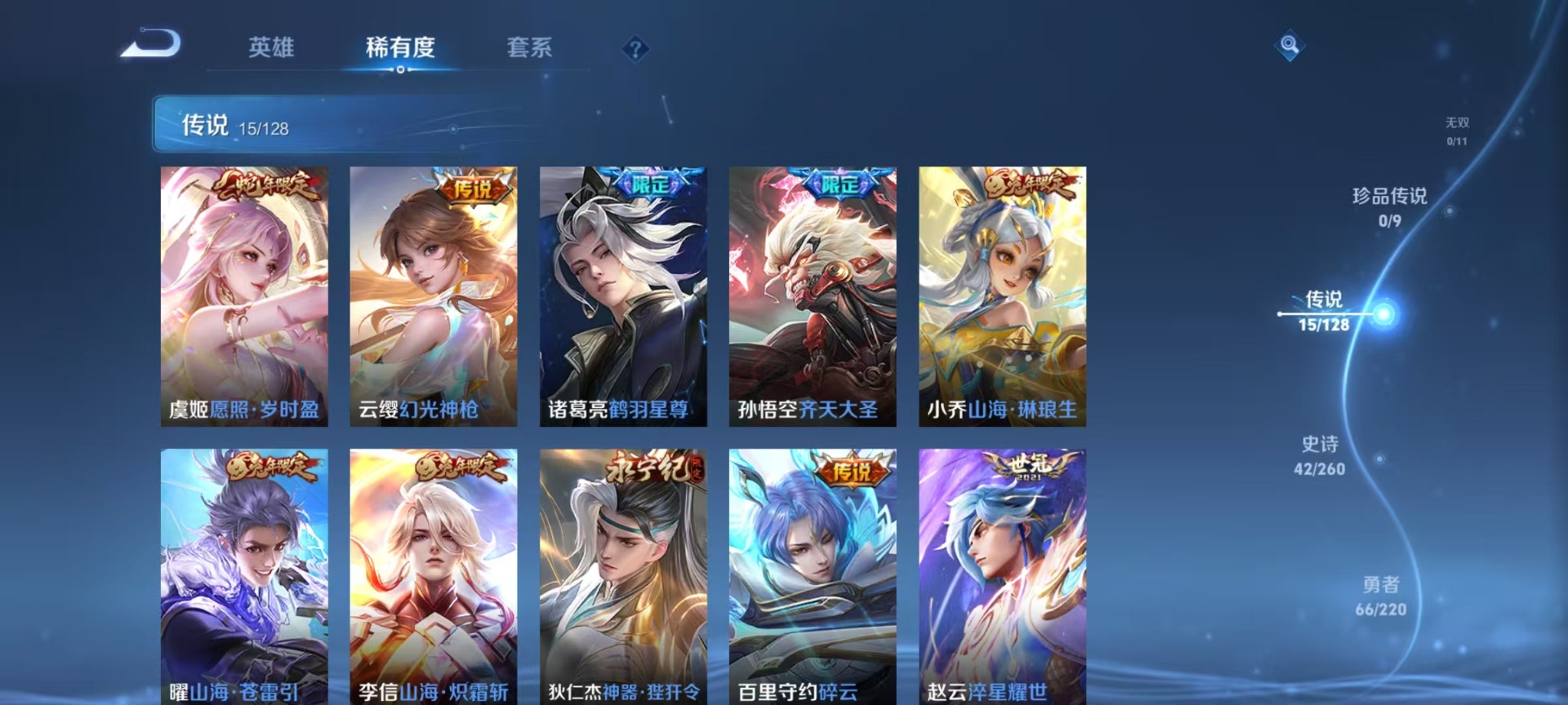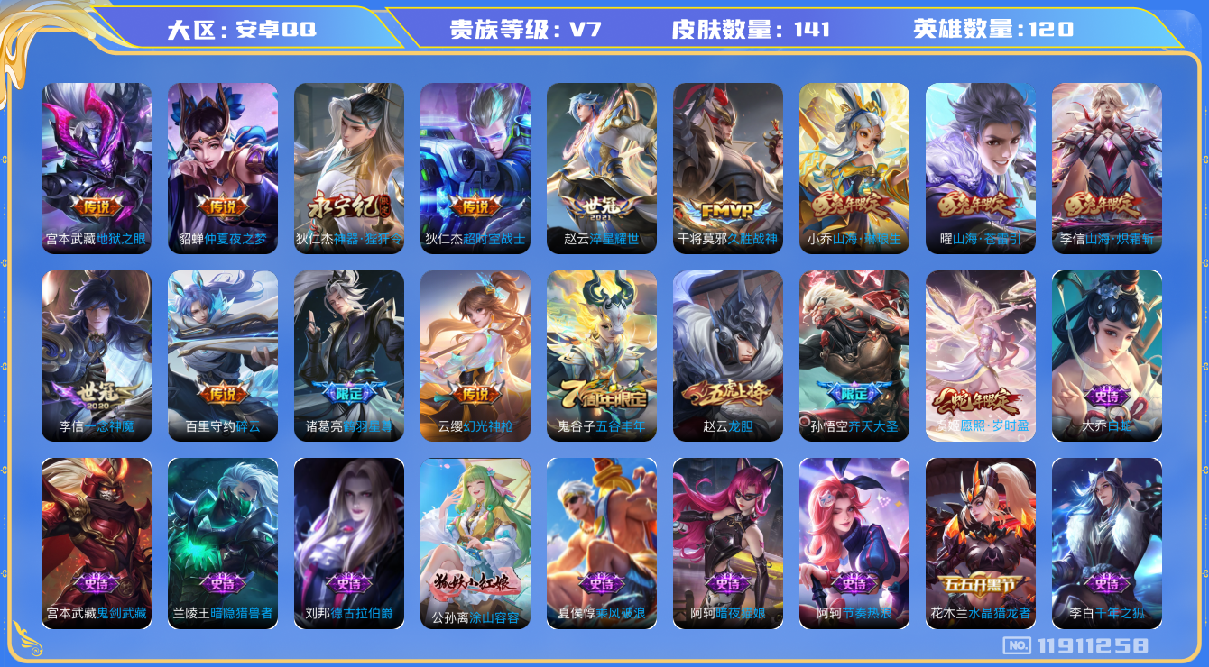 [11911258]V7 15传说 120英雄 141皮肤 可修改实名 优质装备:久胜战神,一念神魔,仲夏夜之梦(大飞蛾),地狱之眼,淬星耀世,超时空战士-狄仁杰,碎云,神器·狴犴令,山海·炽霜斩(李信年限),山海·琳琅生(小乔年限),山海·苍雷引(电光曜子),鹤羽星尊,涂山容容 传说皮:幻光神枪 珍宝阁皮:玩趣恶龙 限定皮:愿照·岁时盈(虞姬年限),齐天大圣,五谷丰年,龙胆 史诗皮:龙之律动,织梦人,黄金分割率,千年之狐,百解令(蒙犽),冰冠公主,青蛇,偶像歌手,白蛇,晚萤,电玩·爆裂旋风,暗夜猫娘,末日机甲-吕布,猫狗日记-孙策,时之恋人-孙尚香,节奏热浪,水果甜心,星夜王子,功夫厨神,德古拉伯爵,暗隐猎兽者,鬼剑武藏,纤云弄巧,乘风破浪,逐浪之夏,水晶猎龙者,箭羽风息,金属风暴,鹰眼统帅,暗夜贵公子,魅力维加斯,赏金猎手,无心,未来纪元-赵云