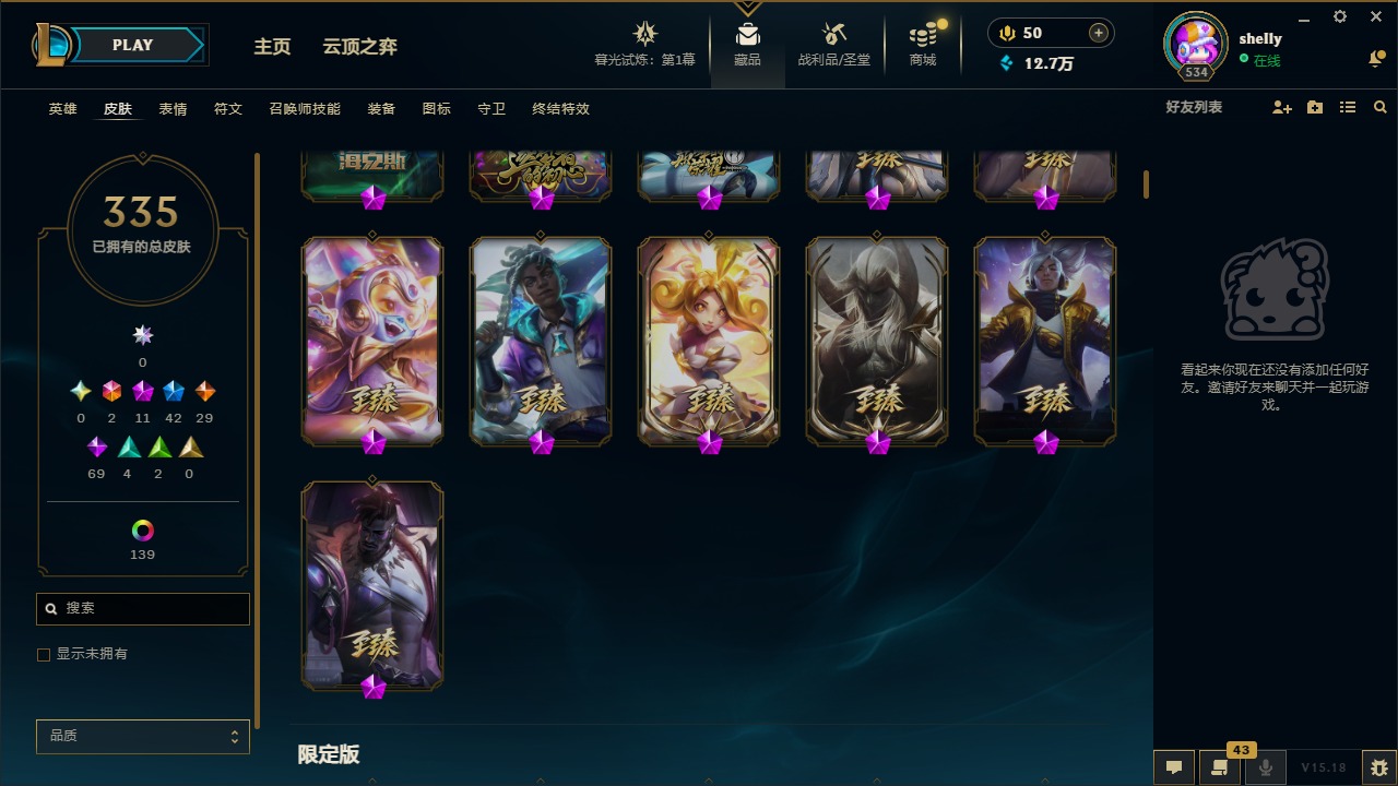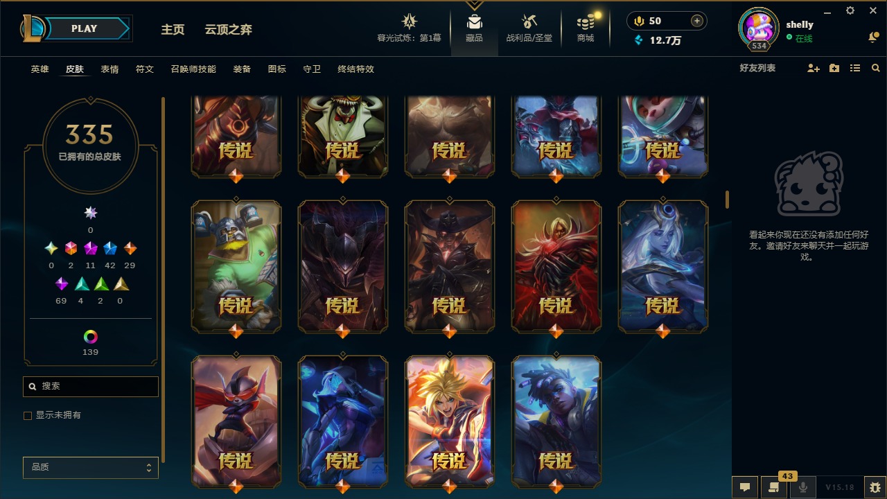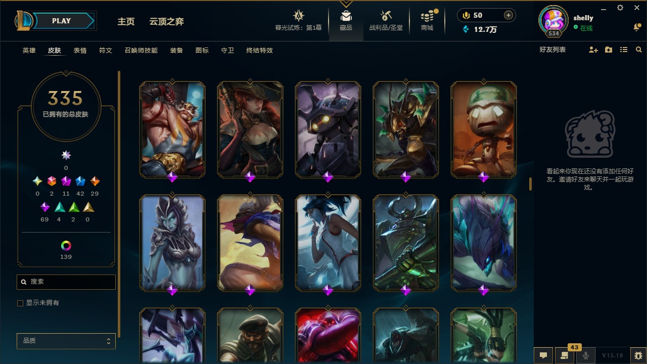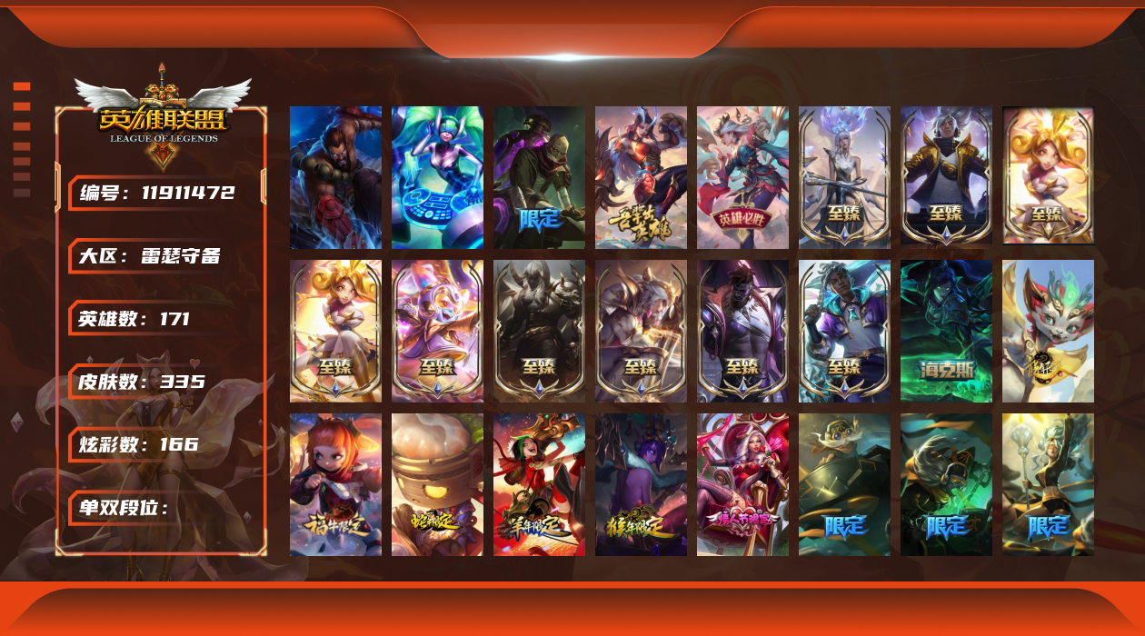[11911472]2终极 11神话 42限定 29传说 69史诗 335皮肤 166炫彩 171英雄 可二次 可修改实名 优质装备:至臻 腥红之月 亚托克斯,至臻 星之守护者 妮寇,至臻 太空律动 节奏幻师 璐璐,至臻 女帝 黛安娜,至臻 真实伤害 亚索,源代码 乐芙兰,防爆天使 凯尔,暗影 沃里克,都铎王朝 图奇,防爆士兵 炼金,冠军之箭 艾希,惊悚派对 阿木木,克格汪 克格莫,至臻 星之守护者 艾克,灵魂守卫,DJ-娑娜,至臻 海珀利安小队 迦娜,至臻 至高天 奎桑提,至臻 星之守护者 妮蔻,山海绘卷 科加斯 朱红,灰烬守护者 慎 余烬觉醒,西部天使 赛娜 神选天使长,无畏骑士 瑟庄妮 赤子初心,可爱可爱粉红红 布里茨,星之守护者 金克丝 黑洞,咖啡甜心 璐璐 焦糖布丁,净雪之月 莫甘娜 冬虹,咖啡甜心 格温 酒醉樱桃,十五周年纪念 希维尔,灌篮高手 德莱厄斯 金色神话,魔女 阿卡丽 虚荣 海克斯:摄魂 薇恩 限定:玉剑传说 舞龙卫,玉剑传说 翼剑仙,双城之战2 微光实验室 辛吉德 情人节限定:觅心女王 寒冰 赛季限定皮:胜利凤凰 艾尼维亚,胜利之运 崔斯特,胜利剑圣 易,胜利女神 娑娜,胜利巨口 克格莫,胜利之王 泰达米尔,胜利女神 瑟庄妮 冠军限定系列:S1FNC 酒桶,S1FNC 迦娜,S1FNC 卡尔萨斯,S1FNC 库奇,S5 SKT T1 滑板鞋 冰雪节限定:冰雪女神 辛德拉,寒冬精灵 璐璐,魄罗骑士 瑟庄妮,圣诞玩偶 波比,冰雪节 茂凯,邪恶圣诞老人 维迦,幸福女神 乐芙兰,雪球也能爆炸 吉格斯 泳池派对:泳池派对 菲奥娜,泳池派对 黑默丁格 万圣节限定:鬼影重重 魔腾,魅惑女巫 莫甘娜,无头骑士 人马,小恶魔 菲兹 年限:点心宝贝 阿木木,天龙之子 斯莫德,羊年 金克丝,猴年 莫甘娜,福牛守护者 安妮