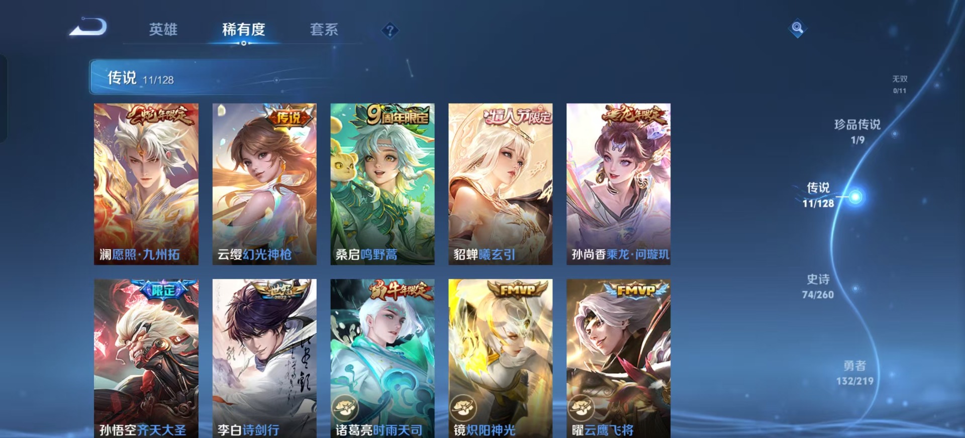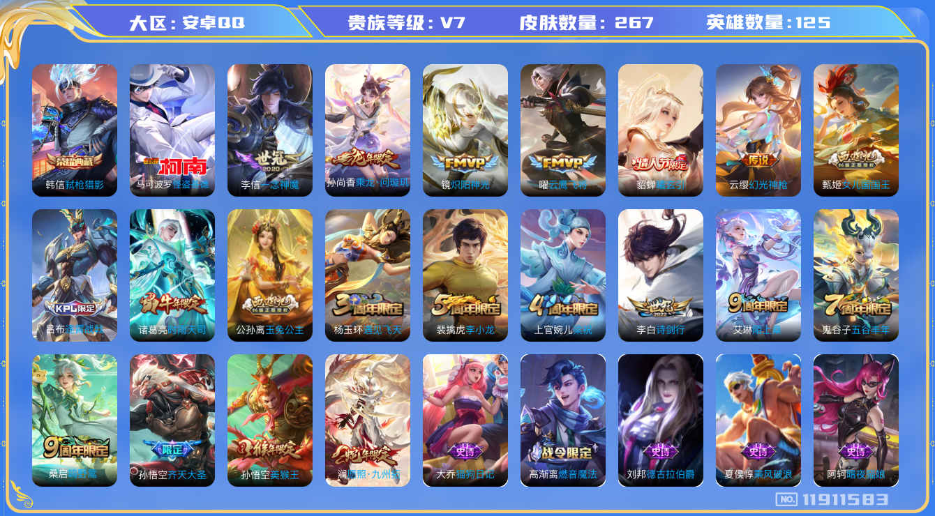 - [11834079]V7 1典藏 1珍品传说 15传说 123英雄 269皮肤 可修改实名 优质装备:全息碎影(猴子典藏),怪盗基德,黄金狮子座,黄金射手座,久胜战神,炽阳神光,一念神魔,时之恋人-刘备(电焊工),淬星耀世,超时空战士-狄仁杰,音你闪耀(rap皮),澜逐花归海,千山共赴,涂山容容 传说皮:祥瑞亨通 珍宝阁皮:胡桃夹子,万物之道 限定皮:愿照·岁时盈(虞姬年限),逐霄战戟,鸣野蒿,至尊宝,凤求凰(白切鸡),傲雪梅枪,五谷丰年,李小龙,孙行者,引擎之心 史诗皮:星界战将,龙之律动,茶境仙,怒海争锋,破空之剑,蔬乡物语(鲁班七号),百相守梦-百里守约,星界特工,百相守梦-黄忠,织梦人,紫霞仙子,苍穹之光,黄金分割率,特工魅影,千年之狐,江河有灵,高渐离燃音魔法,蒙恬荣光圣徽,冰冠公主,青蛇,电玩·爆裂旋风,百相守梦(刘备),猫狗日记-孙策,乱世虎臣,节奏热浪,修罗,水果甜心,天才门将,星夜王子,心灵骇客,德古拉伯爵,暗隐猎兽者,幽灵船长,鬼剑武藏,暗渊魔法,天秀·启明,地狱岩魂,缤纷独角兽,乘风破浪,逐浪之夏,水晶猎龙者,曙光守护者,箭羽风息,金属风暴,原初追逐者,圣诞狂欢,圣诞恋歌,鹰眼统帅,魅力维加斯,黎明之约,未来纪元-赵云