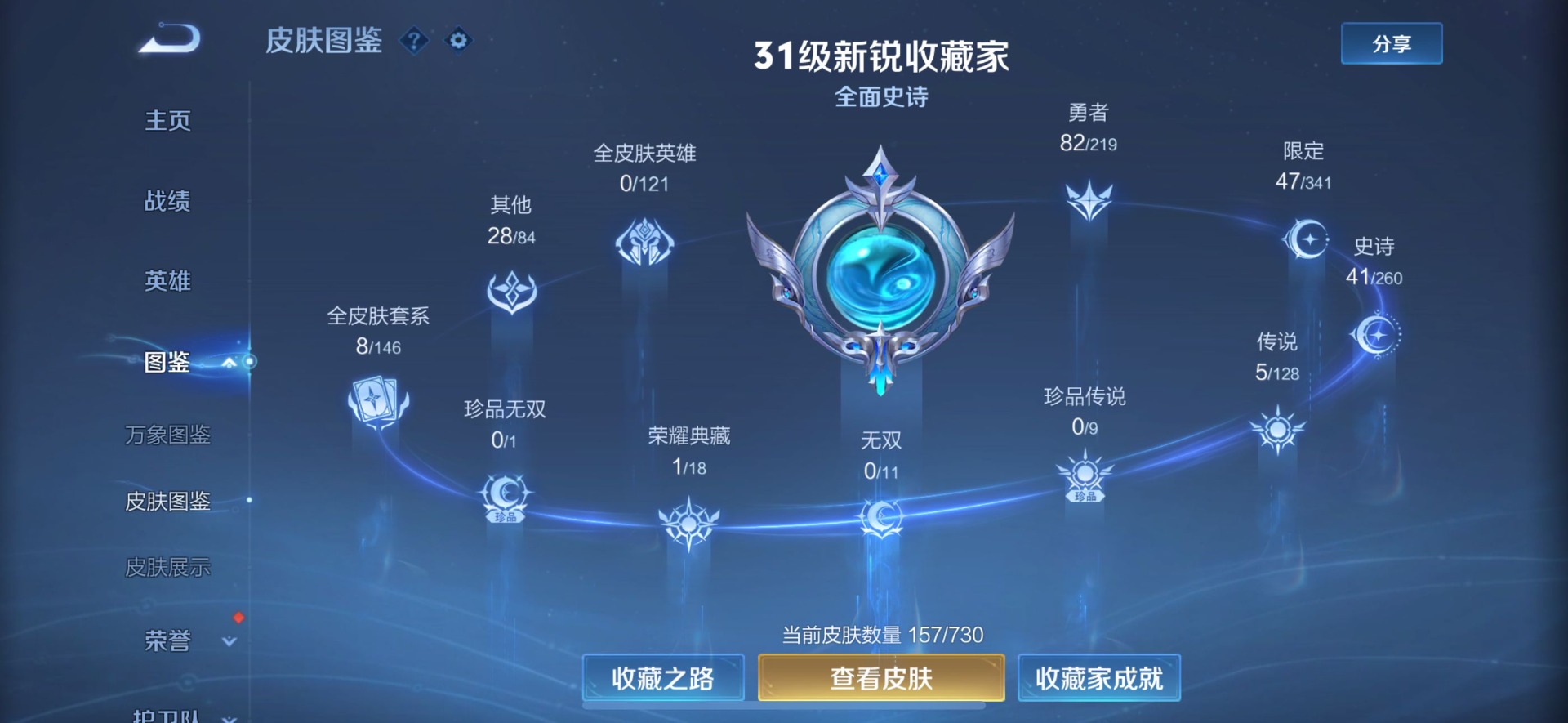 - PX_2108106-Q/至尊星耀/186皮肤/122英雄/0典藏/0珍品无双/0无双/1珍品传说/4传说/43史诗/8稀有英雄 【1 珍品传说】器灵·落星盏 嫦娥, 【4 传说皮肤】久胜战神 干将莫邪,愿照·众生和 妲己,幻光神枪 云缨,鸣野蒿 桑启, 【43 史诗皮肤】紫霞仙子 露娜,高山流水 庄周,银河之约 李元芳,狮舞东方 鲁班七号,德古拉伯爵 刘邦,五谷丰年 鬼谷子,无心 元歌,迷踪丽影