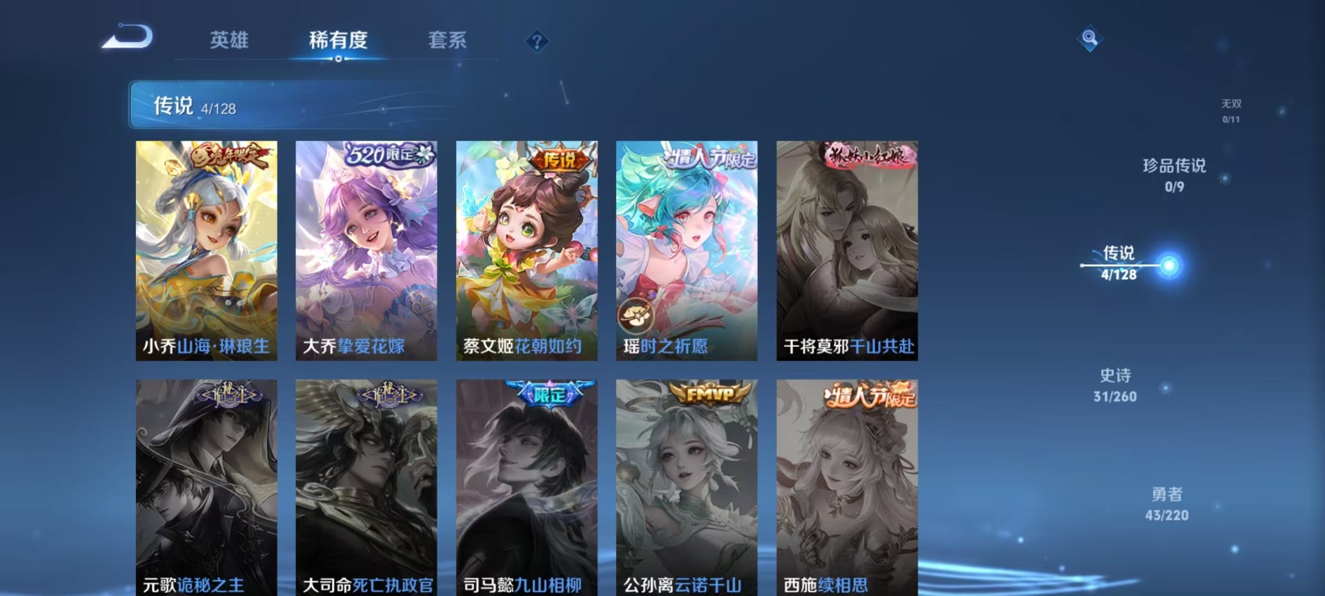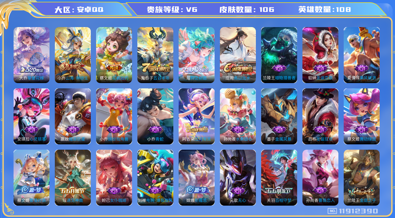 [11912390]V6 4传说 108英雄 106皮肤 可修改实名 优质装备:花朝如约(花篮子),挚爱花嫁,山海·琳琅生(小乔年限) 珍宝阁皮:蔷薇恋人 限定皮:高山流水,五谷丰年,时之祈愿-瑶(瑶传限) 史诗皮:遇见神鹿,江河有灵,青蛇,电玩·爆裂旋风,百相守梦(关羽),女仆咖啡,摇滚巨星,水果甜心,心灵骇客,暗隐猎兽者,舞动绿茵,繁星吟游(呼啦呼啦),拒霜思,缤纷独角兽,乘风破浪,金属风暴,圣诞狂欢,圣诞恋歌,无心