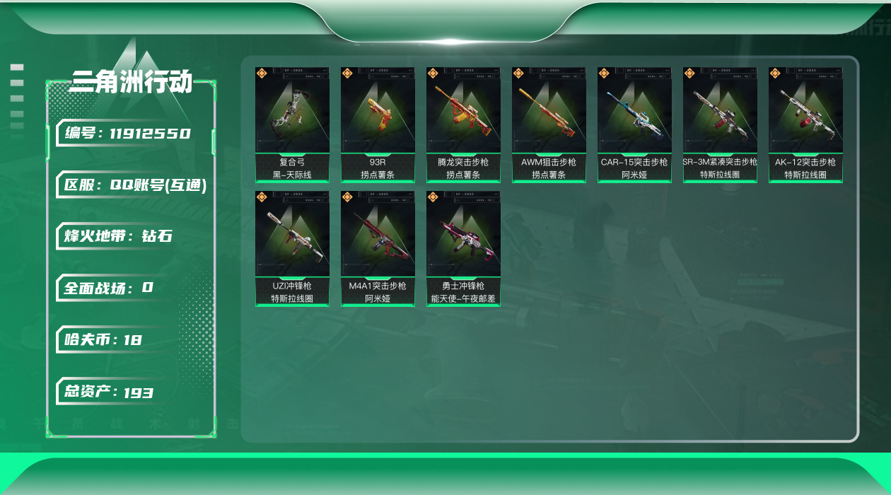 [11912550]总资产:193.8M 10传说枪械 哈夫币:18.719K 可二次 可修改实名 优质装备:顶级安全箱(3x3) 烽火地带段位:钻石 全面战场段位:列兵 传说武器皮肤:UZI冲锋枪-特斯拉线圈,AWM狙击步枪-捞点薯条,腾龙突击步枪-捞点薯条,93R-捞点薯条,AK-12突击步枪-特斯拉线圈,SR-3M紧凑突击步枪-特斯拉线圈,勇士冲锋枪-能天使-午夜邮差,复合弓-黑-天际线,M4A1突击步枪-阿米娅,CAR-15突击步枪-阿米娅